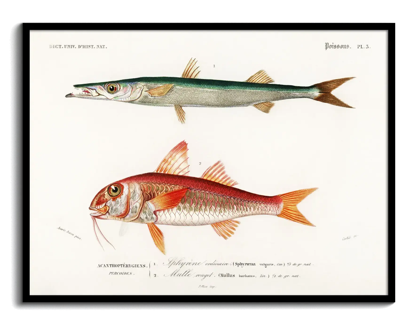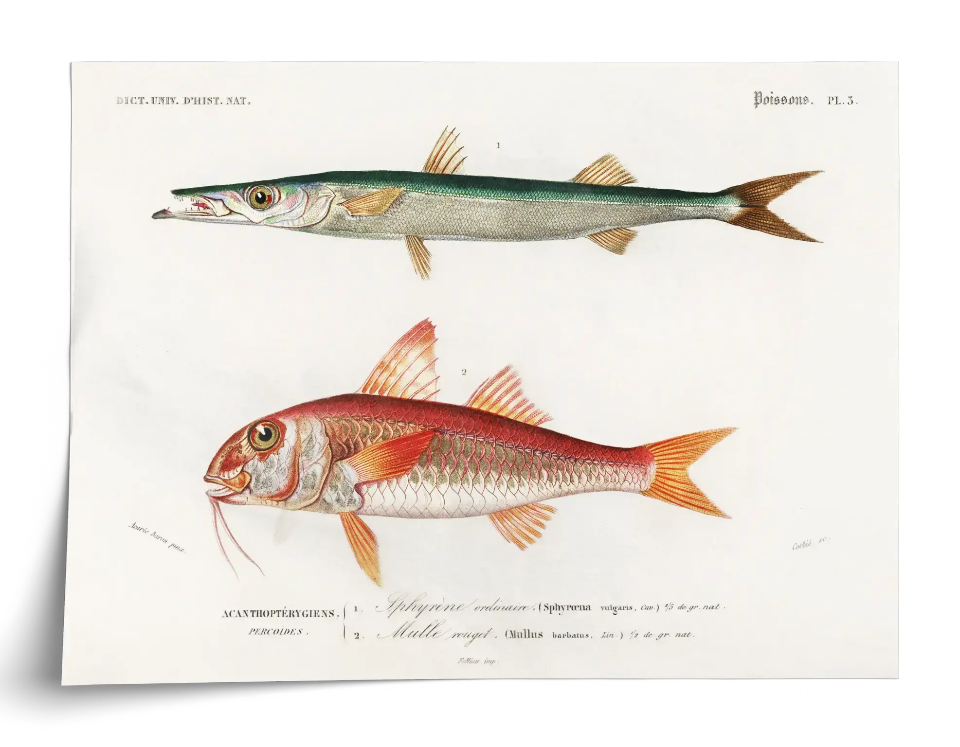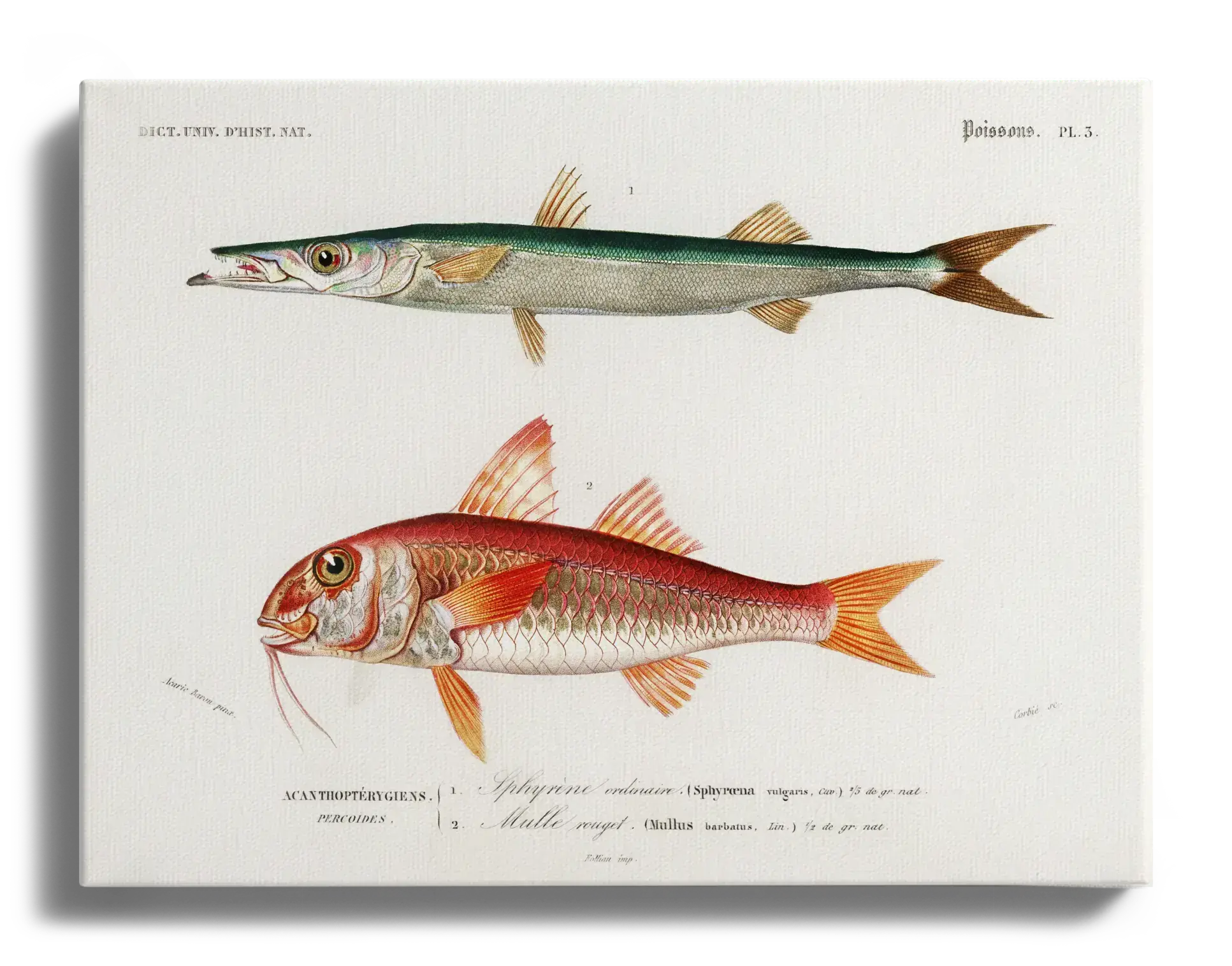 Zum Motiv selbst: Die Tafel vereint wissenschaftliche Präzision mit dekorativer Farbigkeit. Die lateinischen Bezeichnungen Sphyraena und Mullus barbatus sowie die klar gesetzte Typografie rahmen die Darstellung und geben ihr den authentischen Charme einer historischen Lehrtafel. Der cremefarbene Hintergrund lässt die Grüntöne, Rottöne und feinen Schuppenstrukturen ruhig und klar wirken.