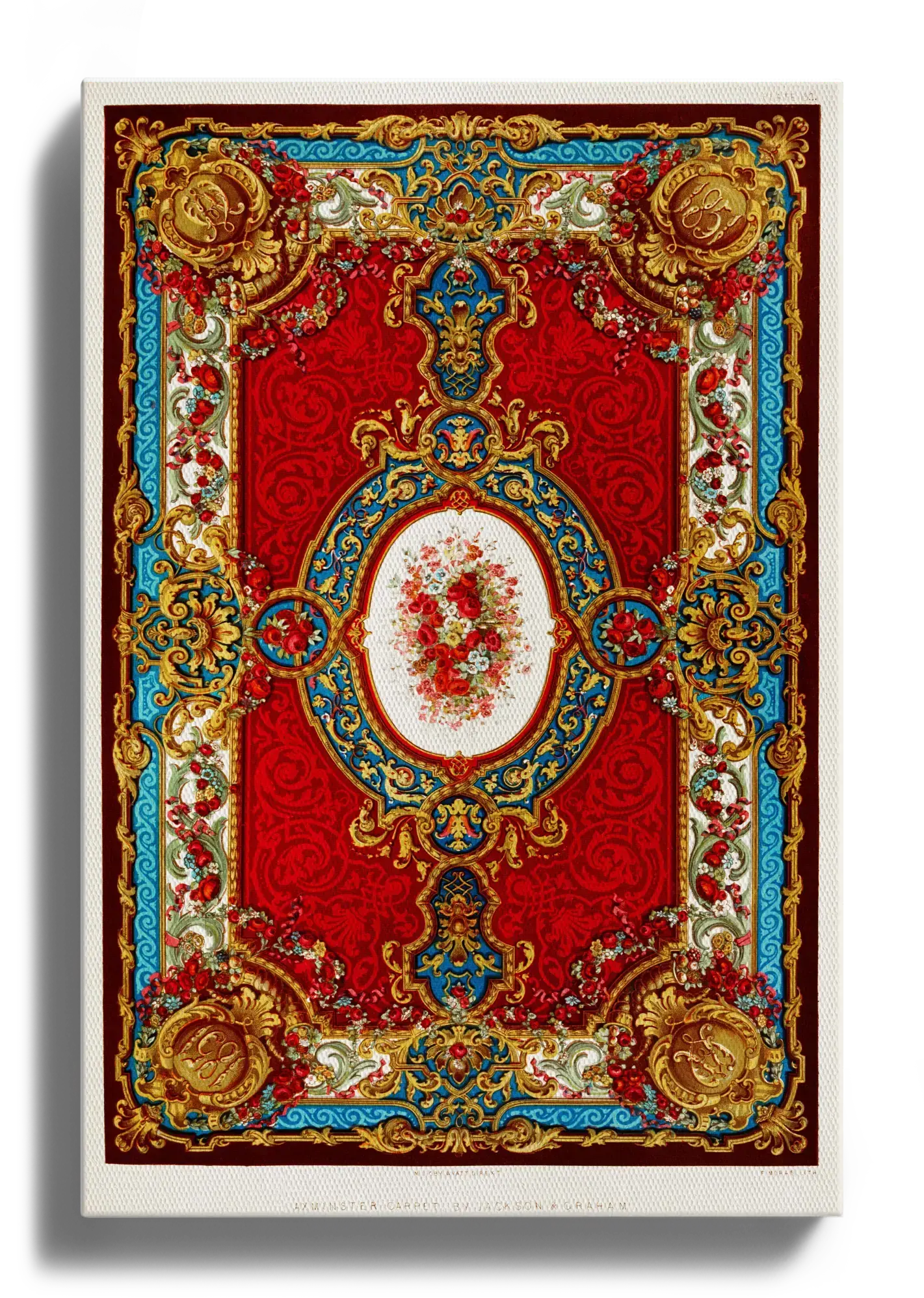 Hol dir dieses Motiv als persönliches Wandbild: Ein prachtvoller Axminster-Teppichentwurf aus der britischen Innenraumkunst des 18./19. Jahrhunderts. Ein satt rotes Feld trägt eine ovale Kartusche mit zartem Blumenbouquet, eingefasst von reichem Blattwerk. Drumherum liegen symmetrische Ornamente in leuchtendem Blau und warmem Gold, dazu feine florale Bänder und Medaillons an den Ecken. Der starke Farbkontrast und die ornamentale Tiefe erzeugen eine elegante, royale Wirkung mit klassischer Note.