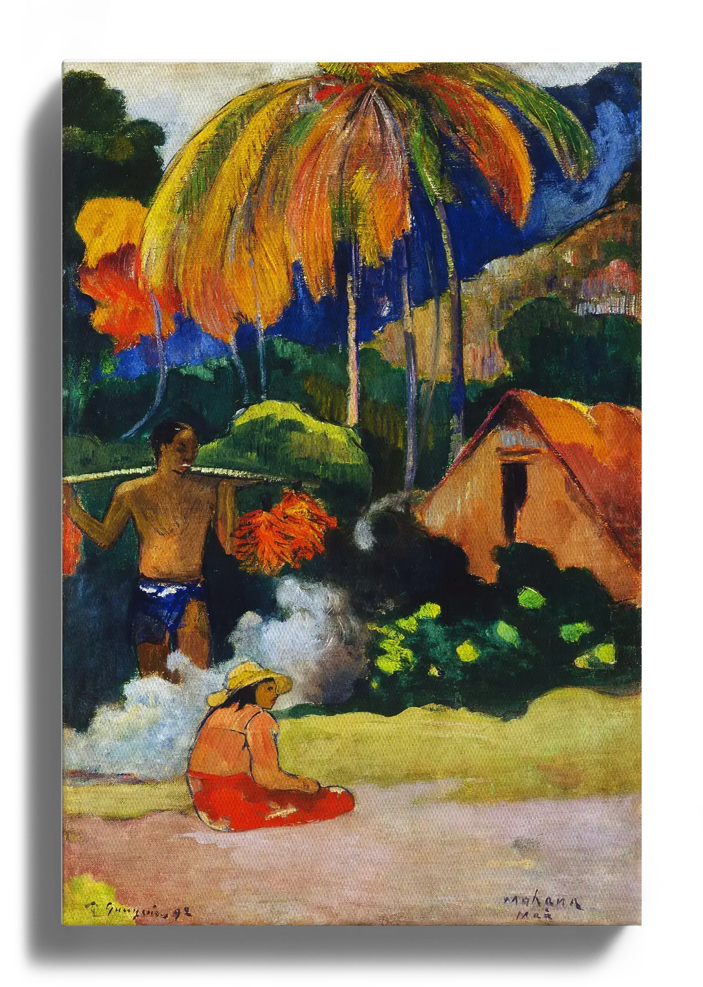 Das Gemälde stammt aus Paul Gauguins Tahiti‑Periode von 1892 und verbindet vereinfachte Formen mit leuchtenden, symbolhaften Farben. Der Blick führt vom ruhigen Vordergrund zur üppigen Vegetation, die große Palme setzt den vertikalen Akzent. Die Figuren wirken still und konzentriert, das Haus verankert die Szene im Alltag. Der lebendige Pinselduktus und die warm‑kühlen Kontraste schaffen eine intensive, aber ausgewogene Komposition.
