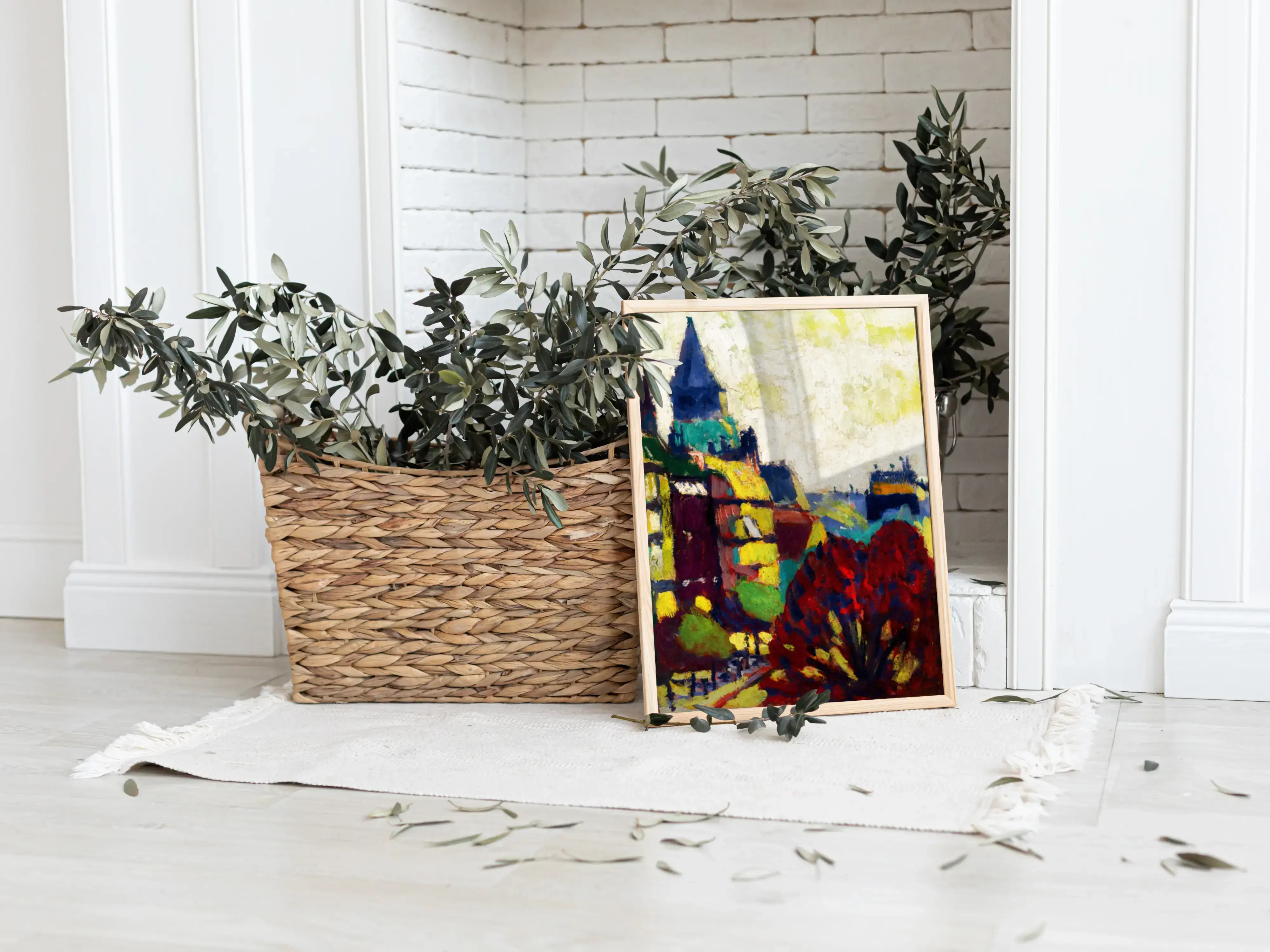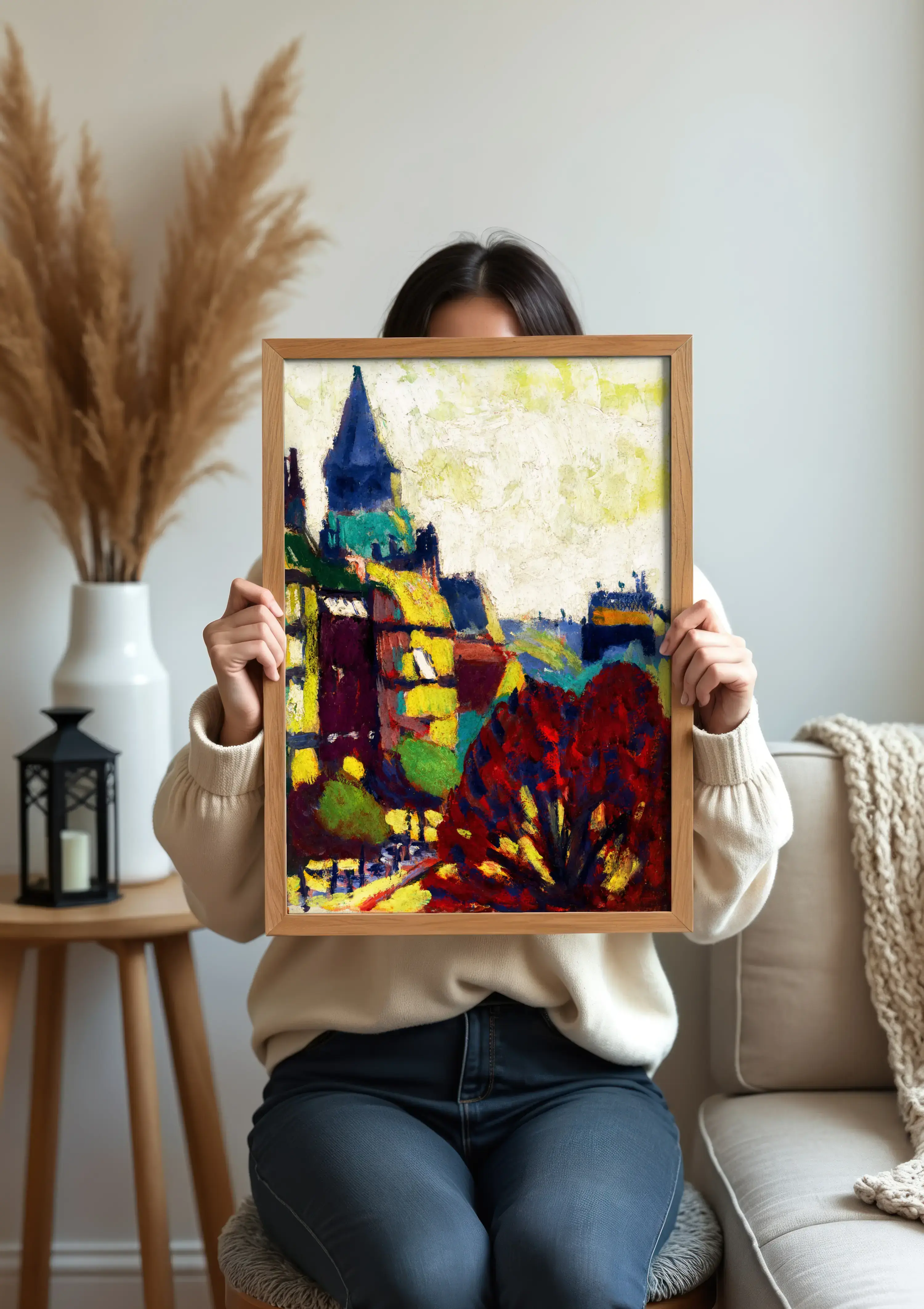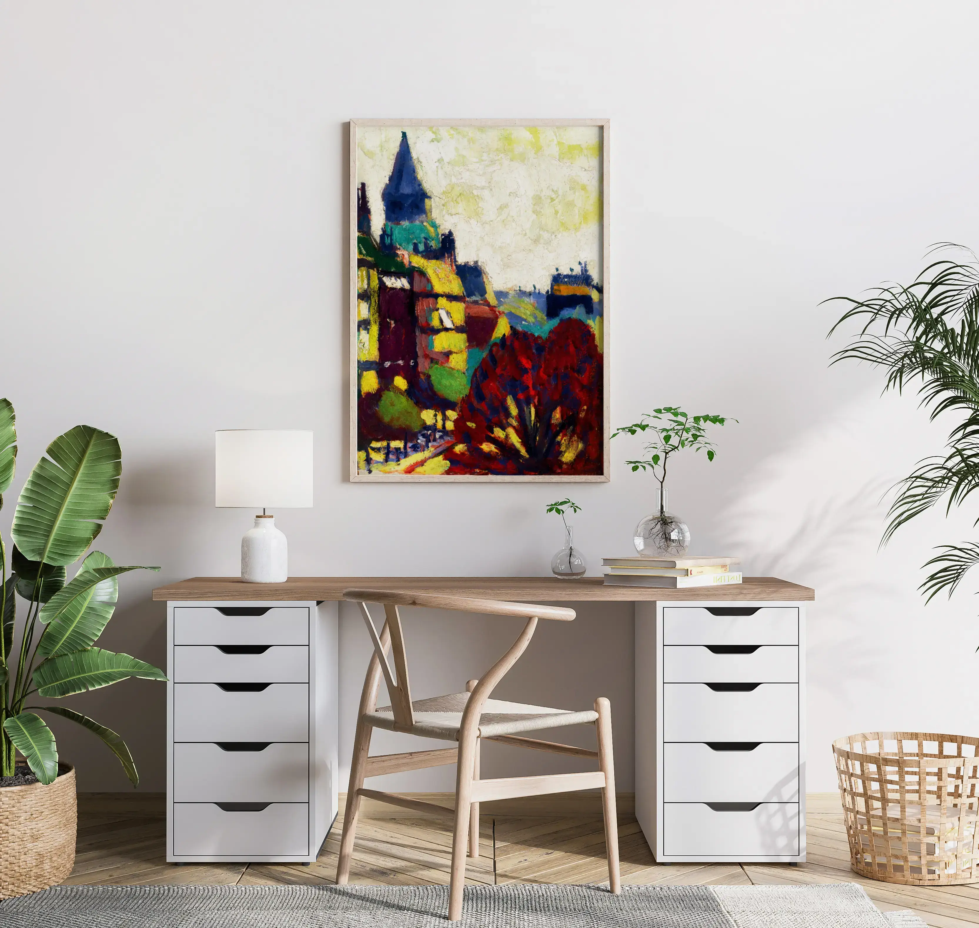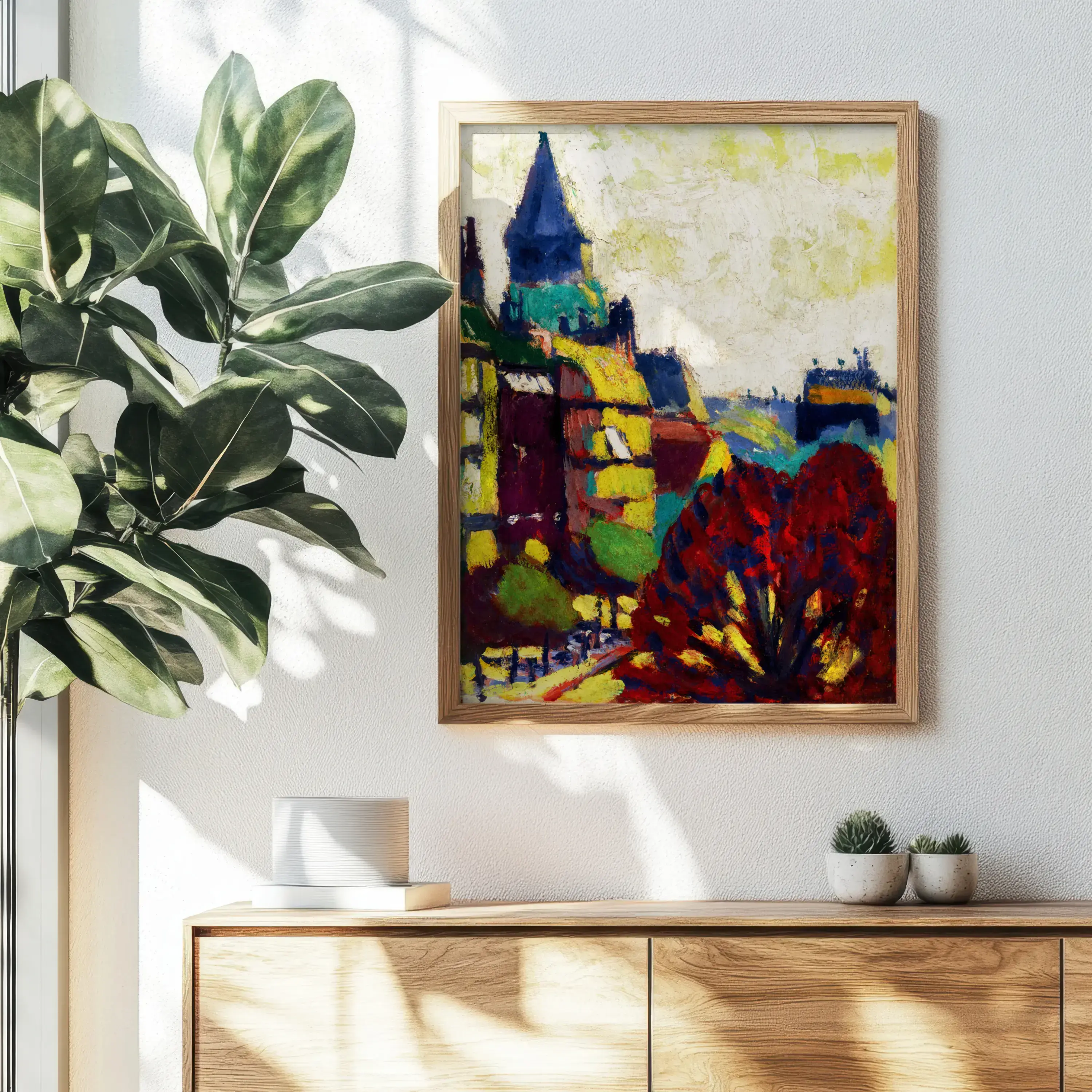 Jetzt gestalten und bestellen: Dieses Motiv zeigt St. Germain des Prés in Paris, gesehen in leuchtenden Farbflächen des frühen 20. Jahrhunderts. Links erhebt sich der dunkle Kirchturm über grünlich schimmernden Dächern, darunter stapeln sich gelbe und bordeauxrote Fassaden. Rechts füllt ein kräftig roter Baum den Vordergrund, dahinter öffnet sich die Stadt in kühlen Blau‑ und Grüntönen. Der helle, pastose Himmel lässt die kontrastreichen Pinselzüge atmen und verleiht der Szene lebendige Tiefe und Bewegung.