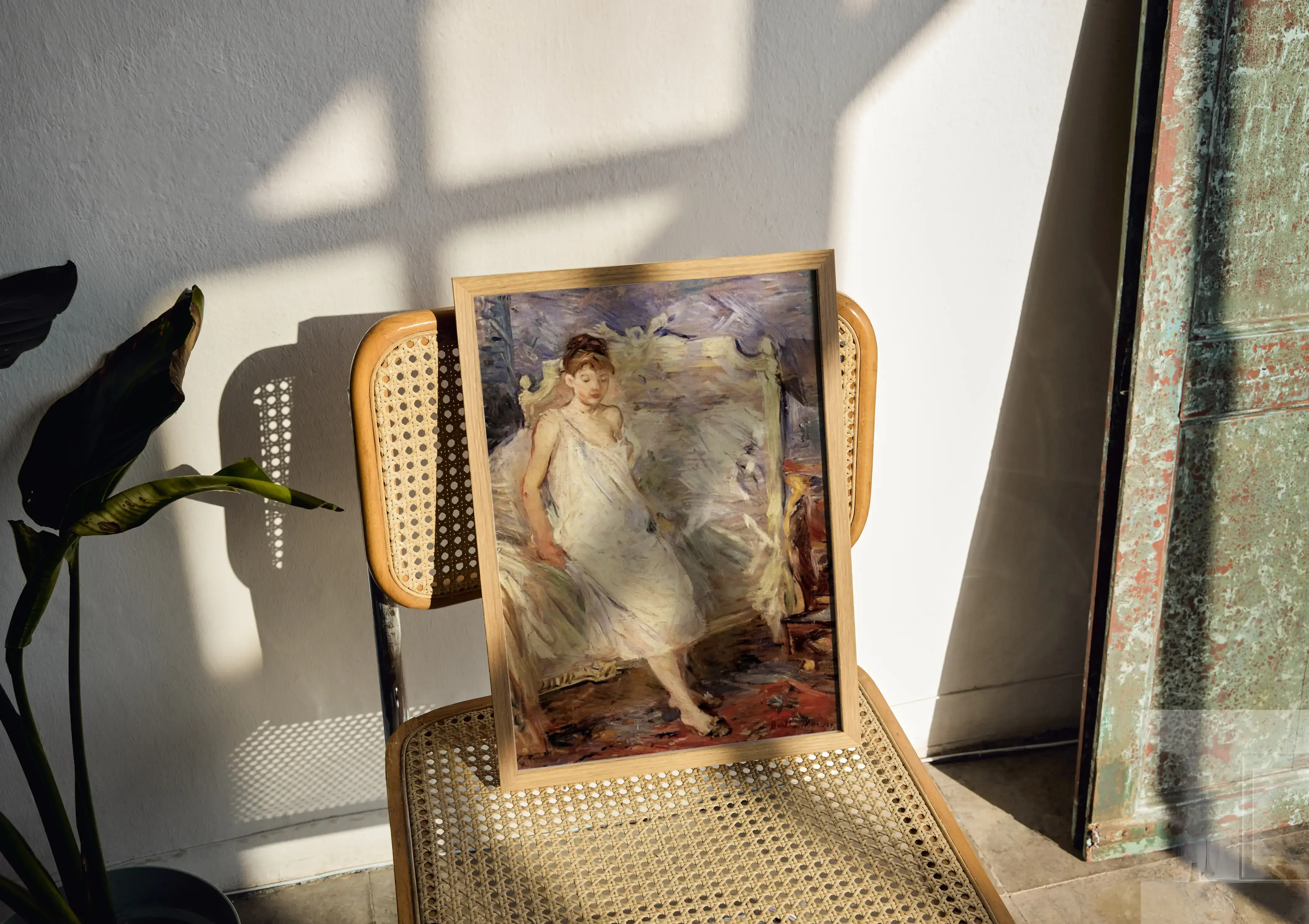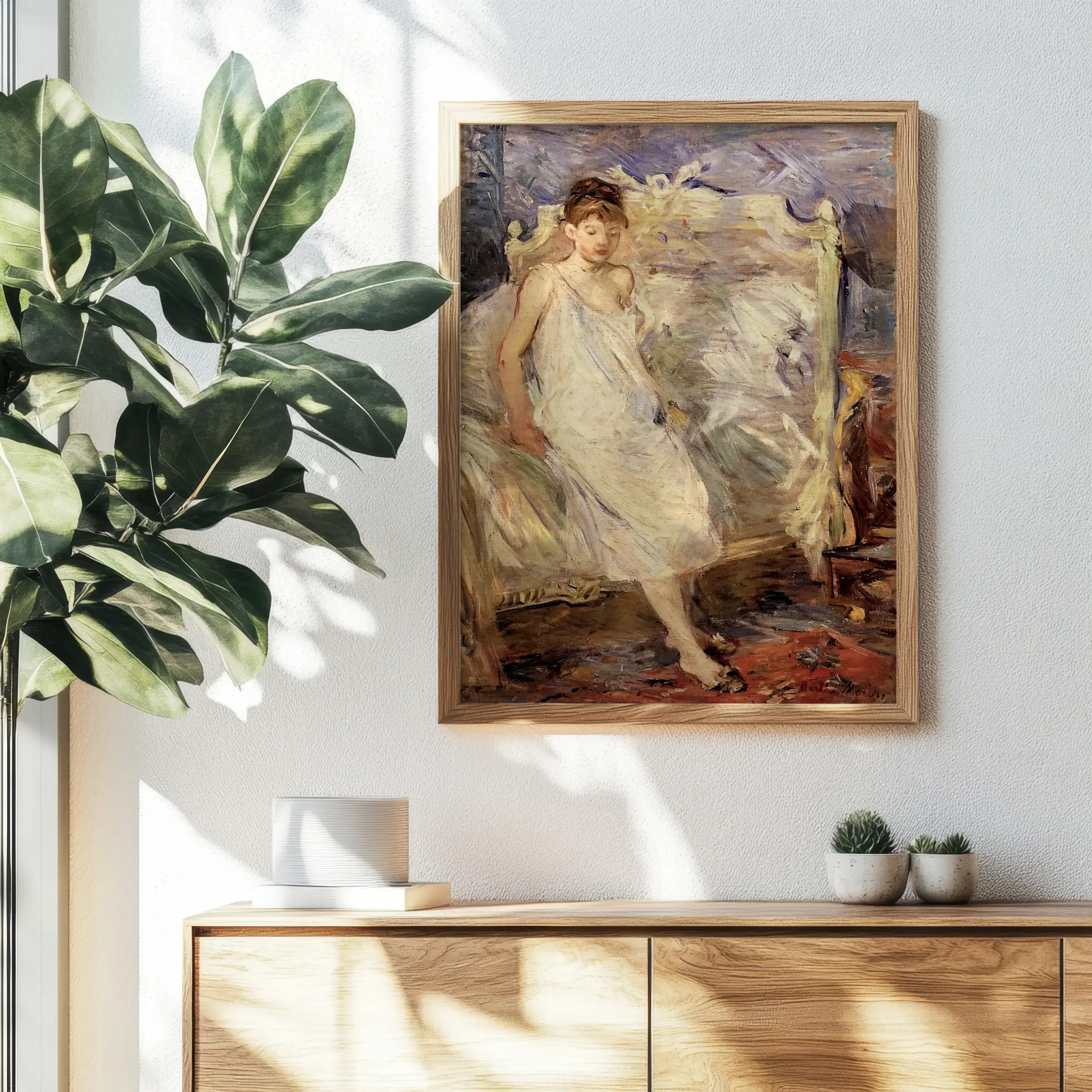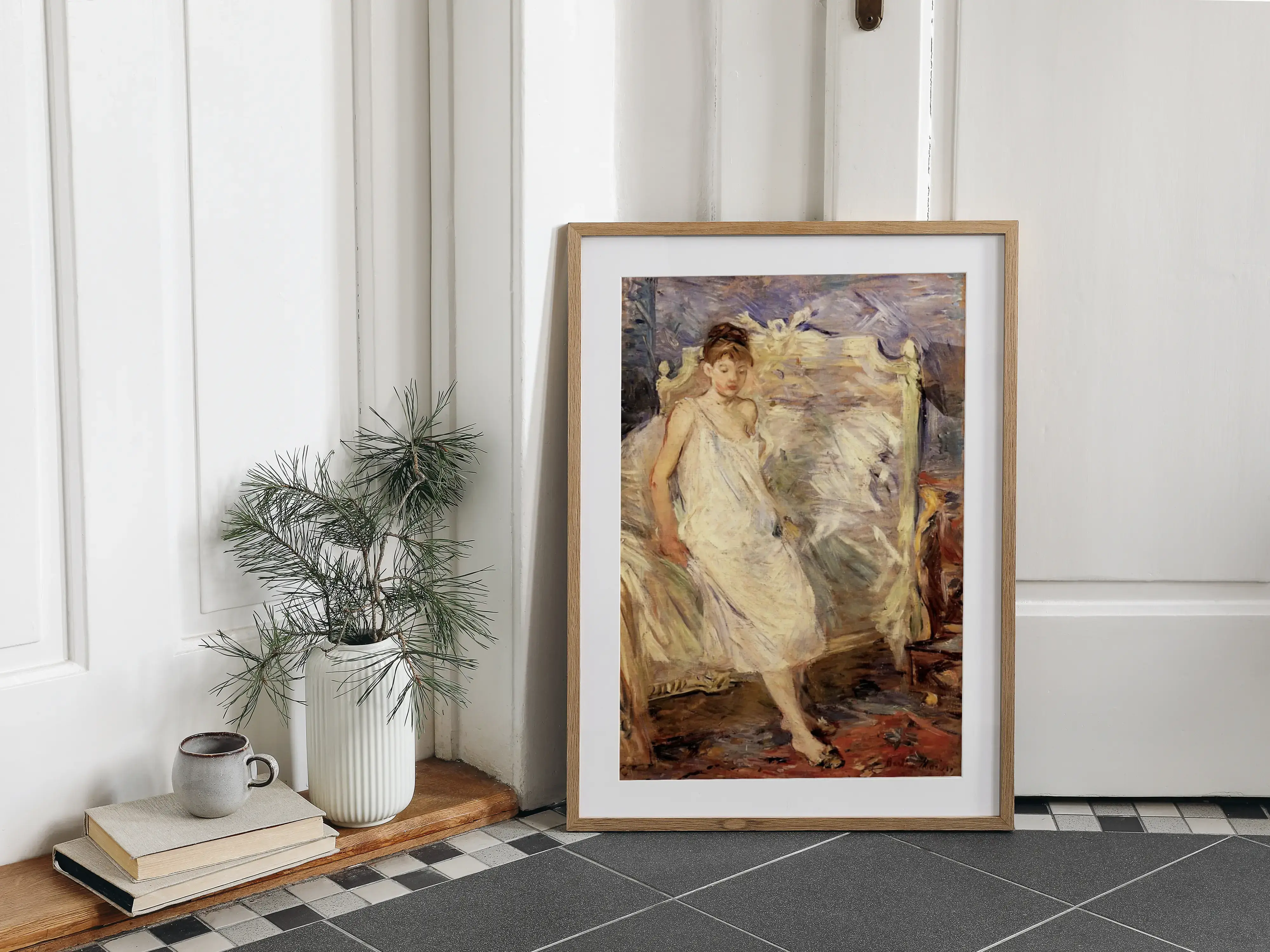 Customize your print now and bring this Impressionist classic to your wall. In this scene by Berthe Morisot, a young woman sits at the edge of a pale, ornate bed or chaise in a light slip, eyes down, lost in thought. Loose, shimmering brushstrokes wash the space with violets, creams, and warm browns, catching the fabric and skin with soft daylight. The intimate pose, textured paint, and airy palette create a quiet, lived‑in mood that feels both relaxed and refined.