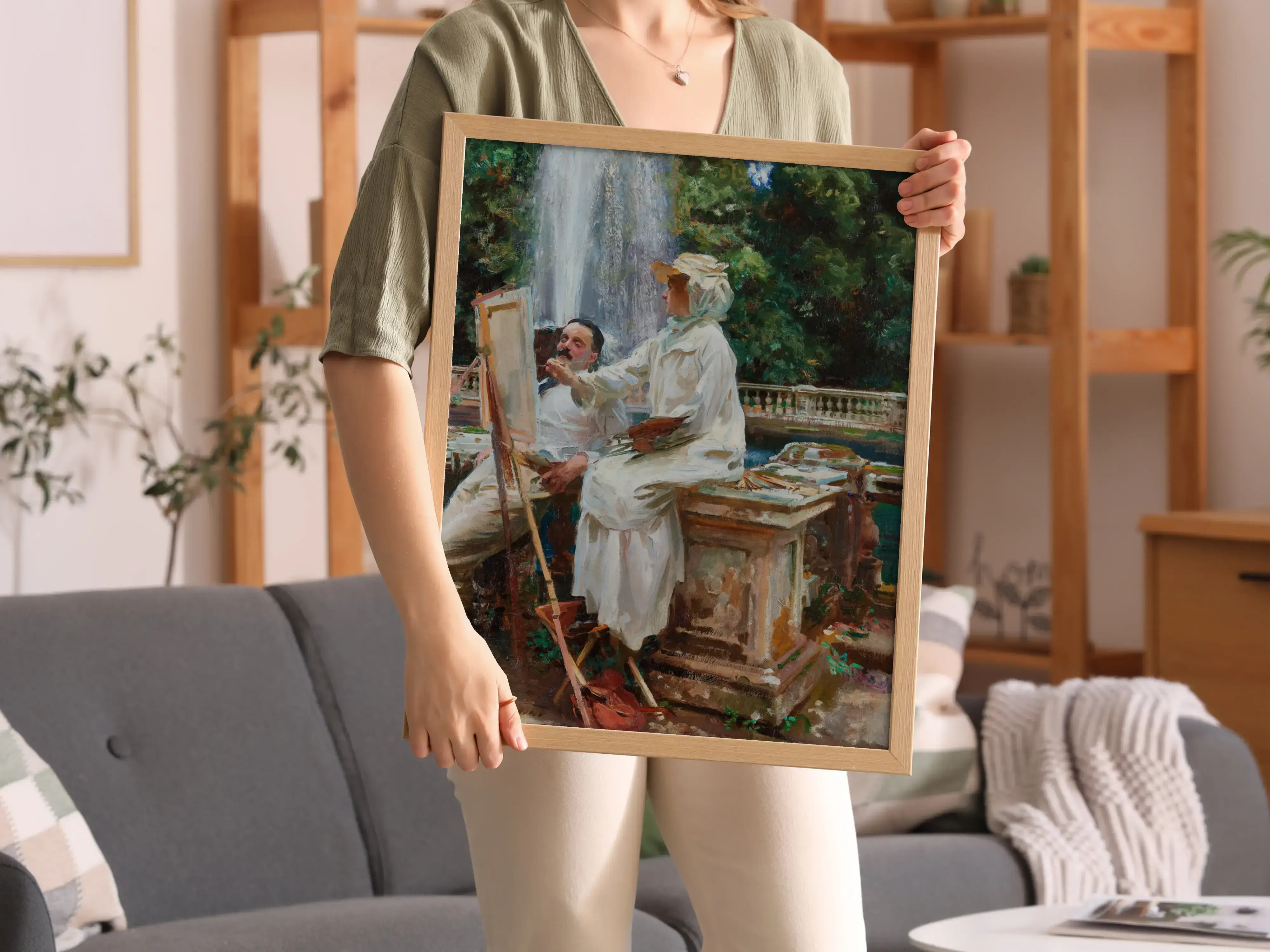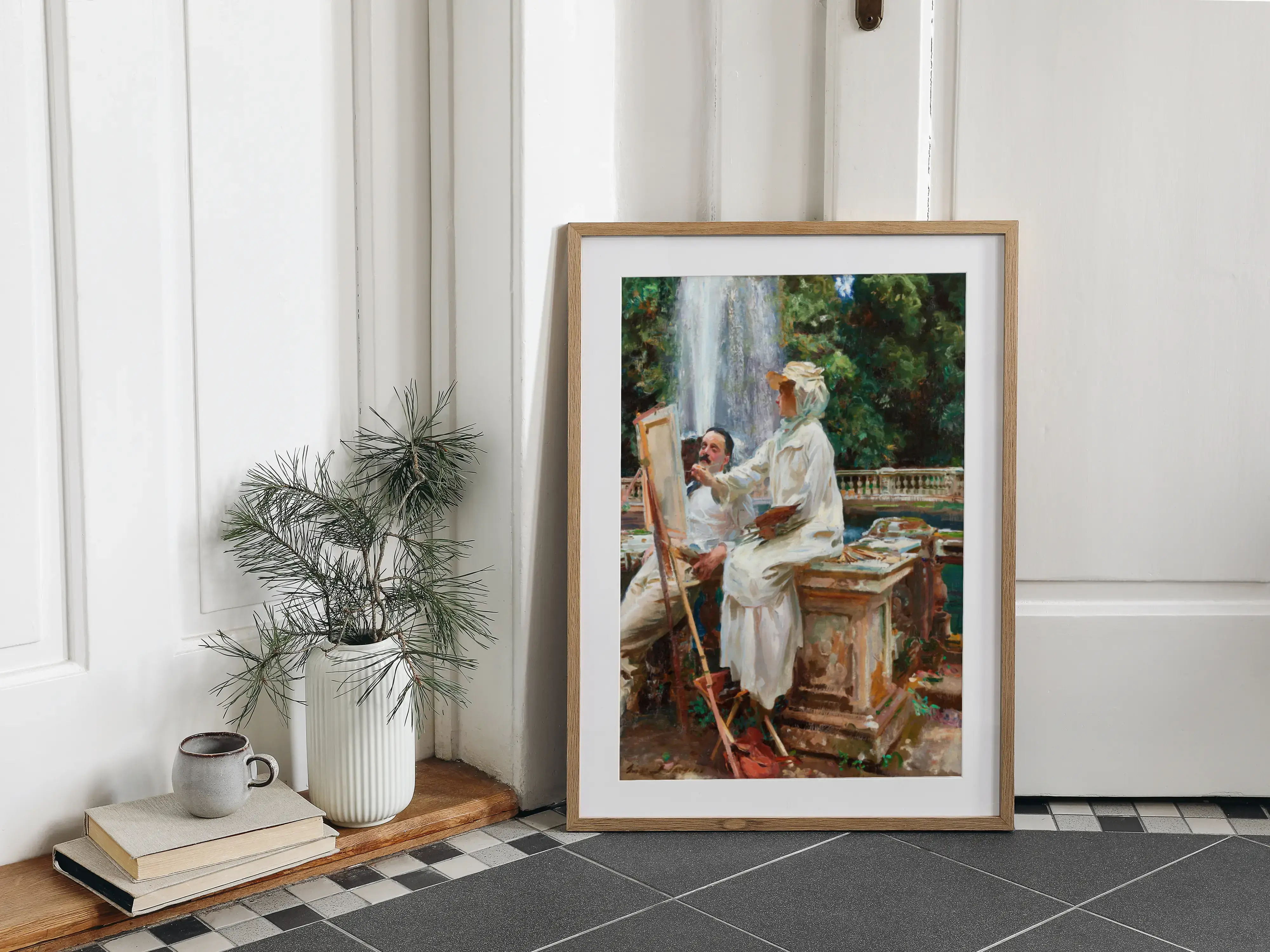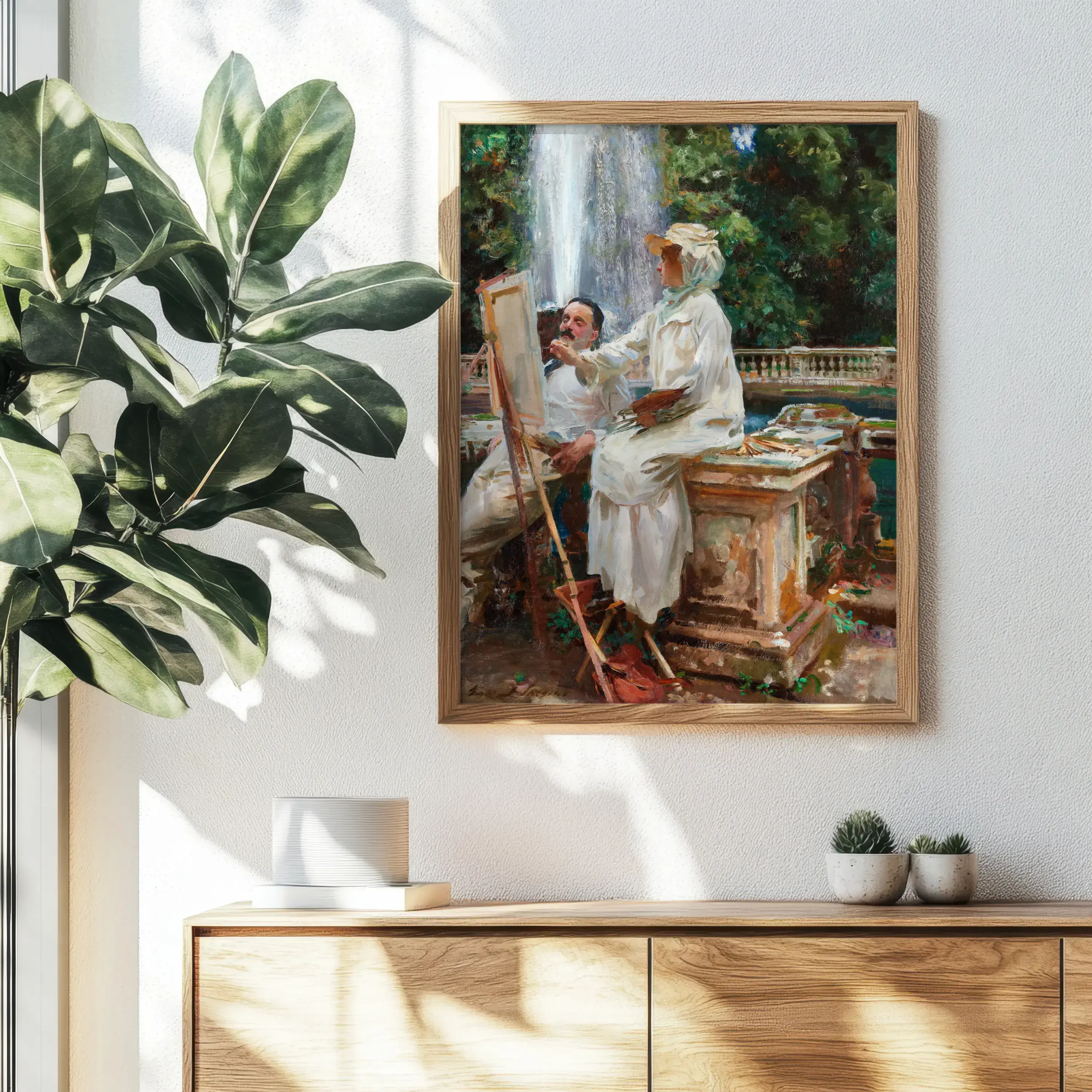 About the motif: Sargent’s quick, confident strokes turn water and foliage into movement and light. Whites glow against cool greens, and the vertical surge of the fountain anchors the composition. The figures, dressed for a day outdoors, share a quiet creative moment amid stone plinths and garden ornaments, evoking leisurely Roman afternoons and the joy of painting on site.