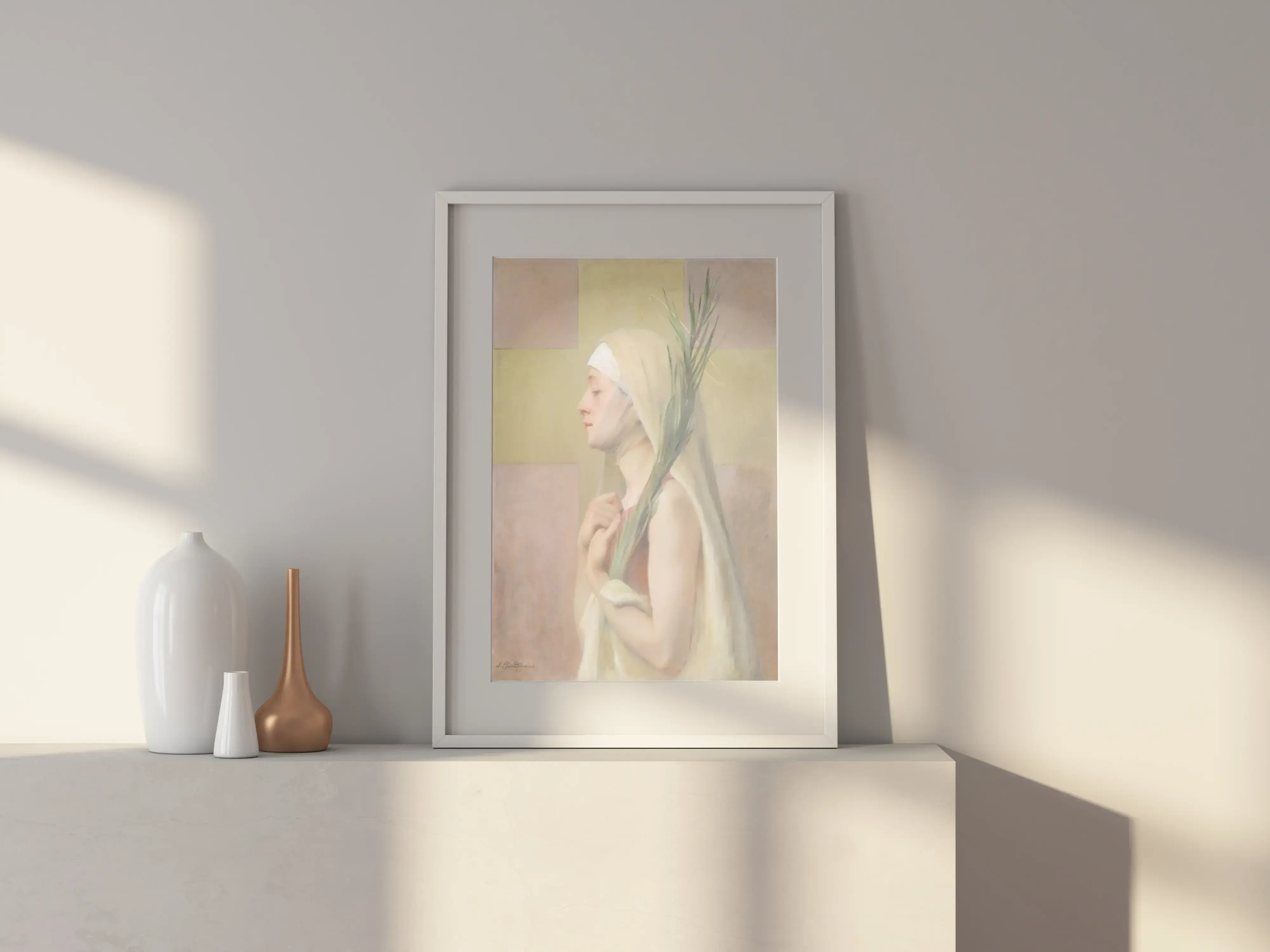 About the motif: the serene profile and closed eyes suggest contemplation and resilience. The palm frond, a traditional sign of martyrdom, contrasts with the soft veil and blush tones of the tunic. The geometric cross in the background simplifies the space, letting light and texture lead the eye. The palette of creams, rose, and muted gold keeps the scene gentle and timeless.
