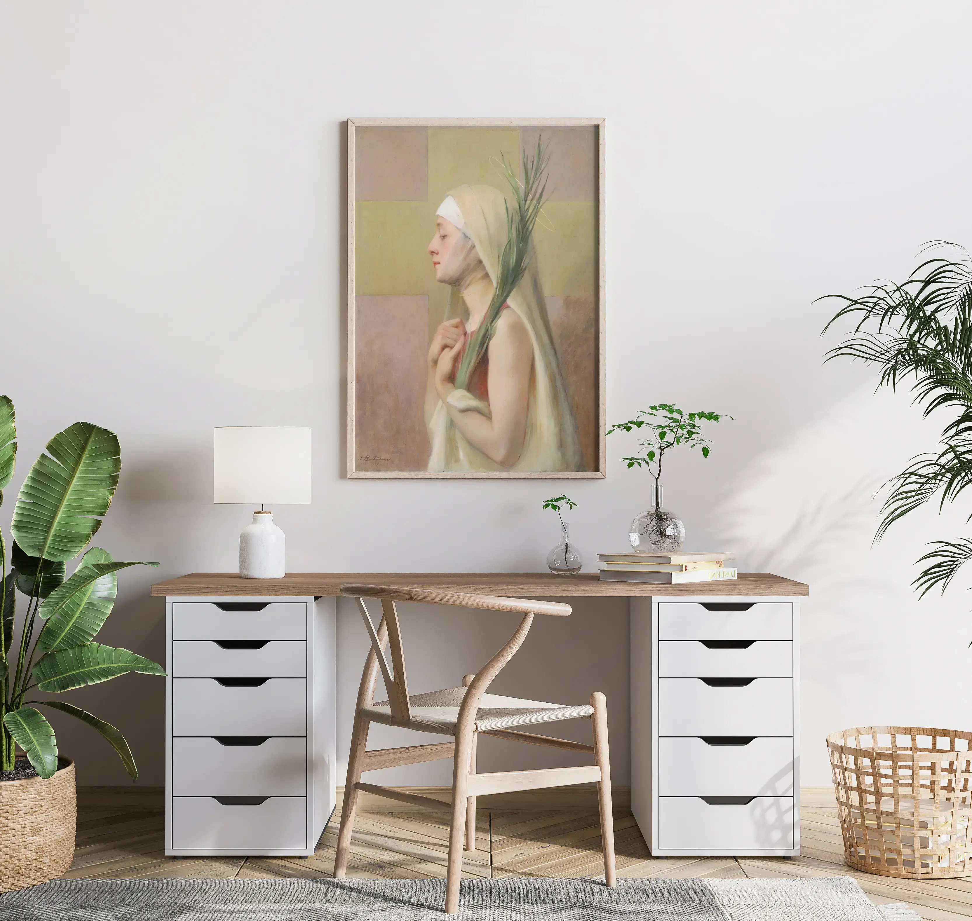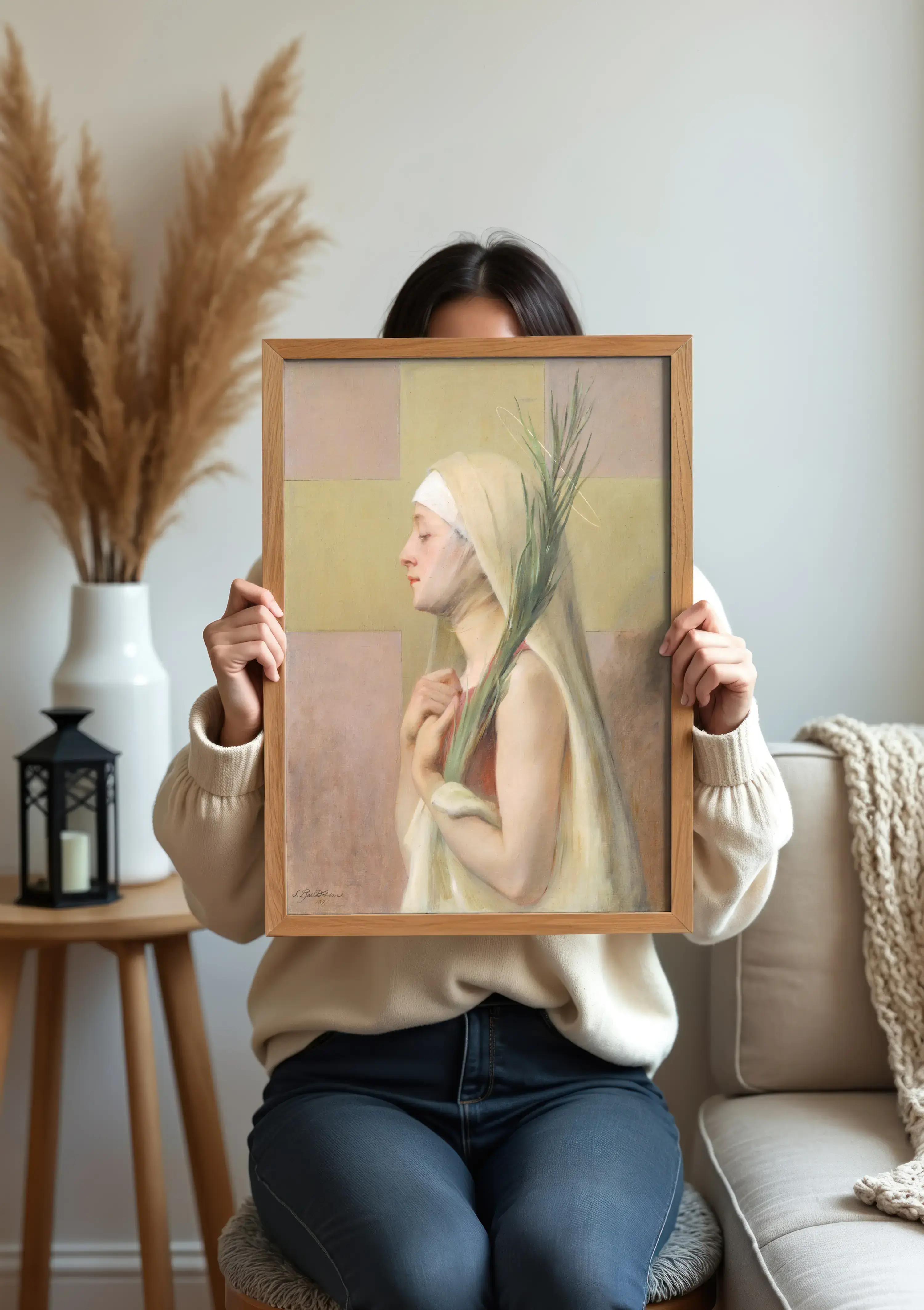Make it yours in the size and finish you love. Une Martyre (Saint Thecla) shows a calm, side‑lit figure in profile, veil draped softly over her hair and shoulders, hands gently clasping a slender palm frond. Two fine halo rings hover near the head, while a muted grid of rosy taupe and pale ochre forms a quiet cross behind her. Subtle brushwork models the skin and fabric with a warm glow, balancing sacred symbolism with understated elegance that blends beautifully into modern spaces.