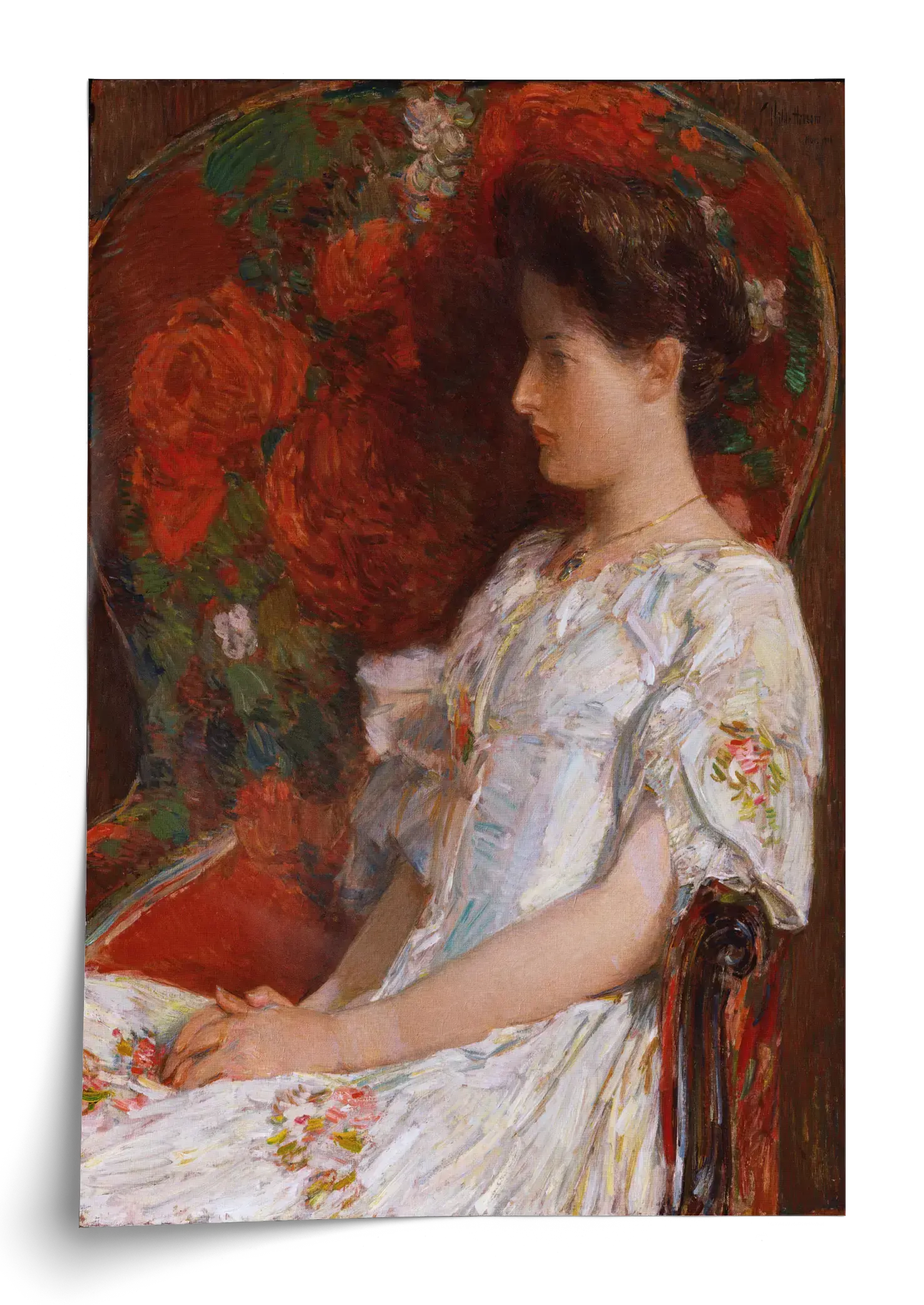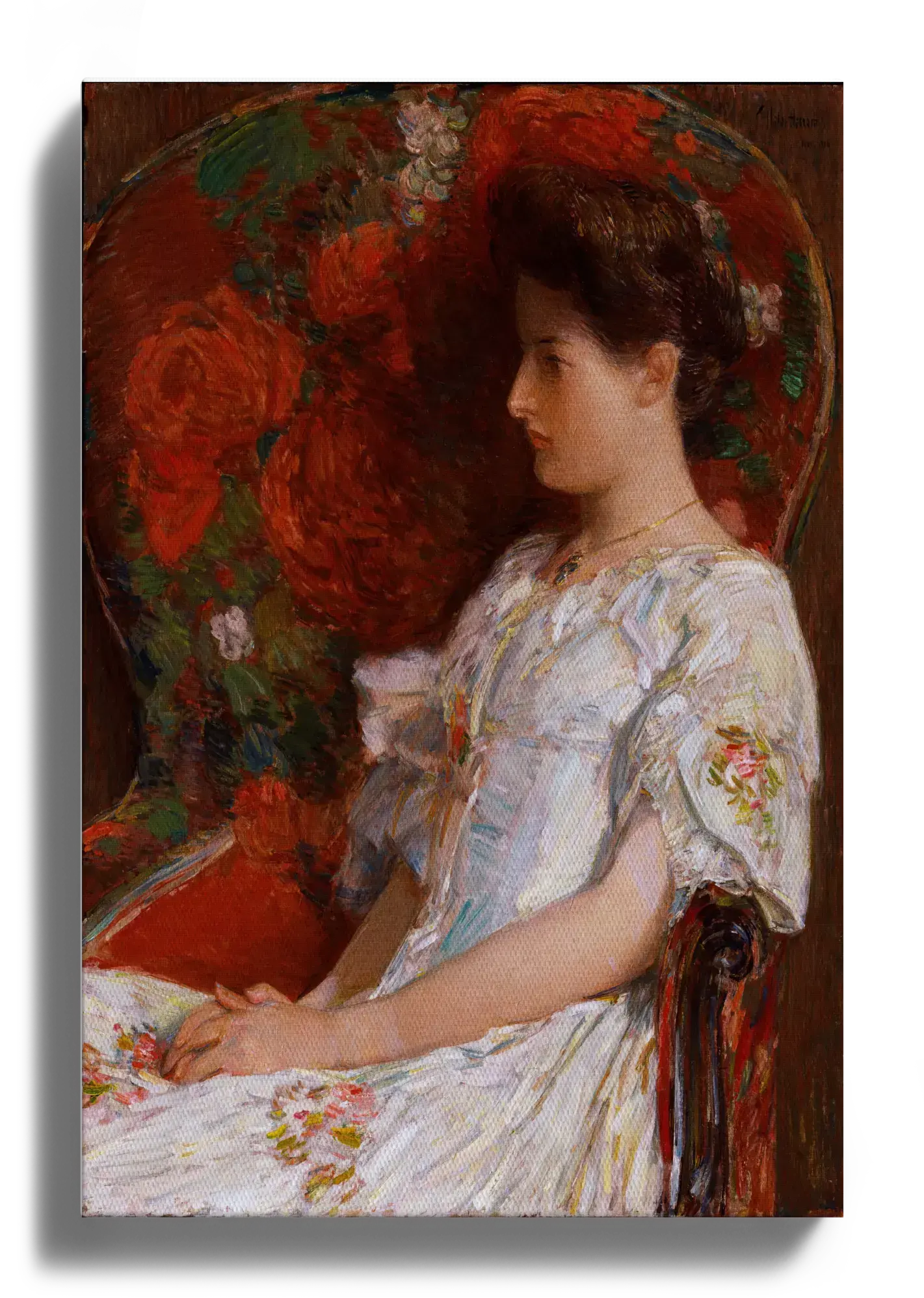 Make it yours today. This artwork captures a poised young woman in profile, seated in a lavish Victorian armchair whose curved back blooms with deep red roses and soft greenery. The gentle light skims across her pale dress, painted in cool whites and pastel strokes that ripple like silk. Her quiet gaze and folded hands create a sense of stillness, while the warm crimson background and lively brushwork lend depth, texture, and an inviting, timeless elegance.