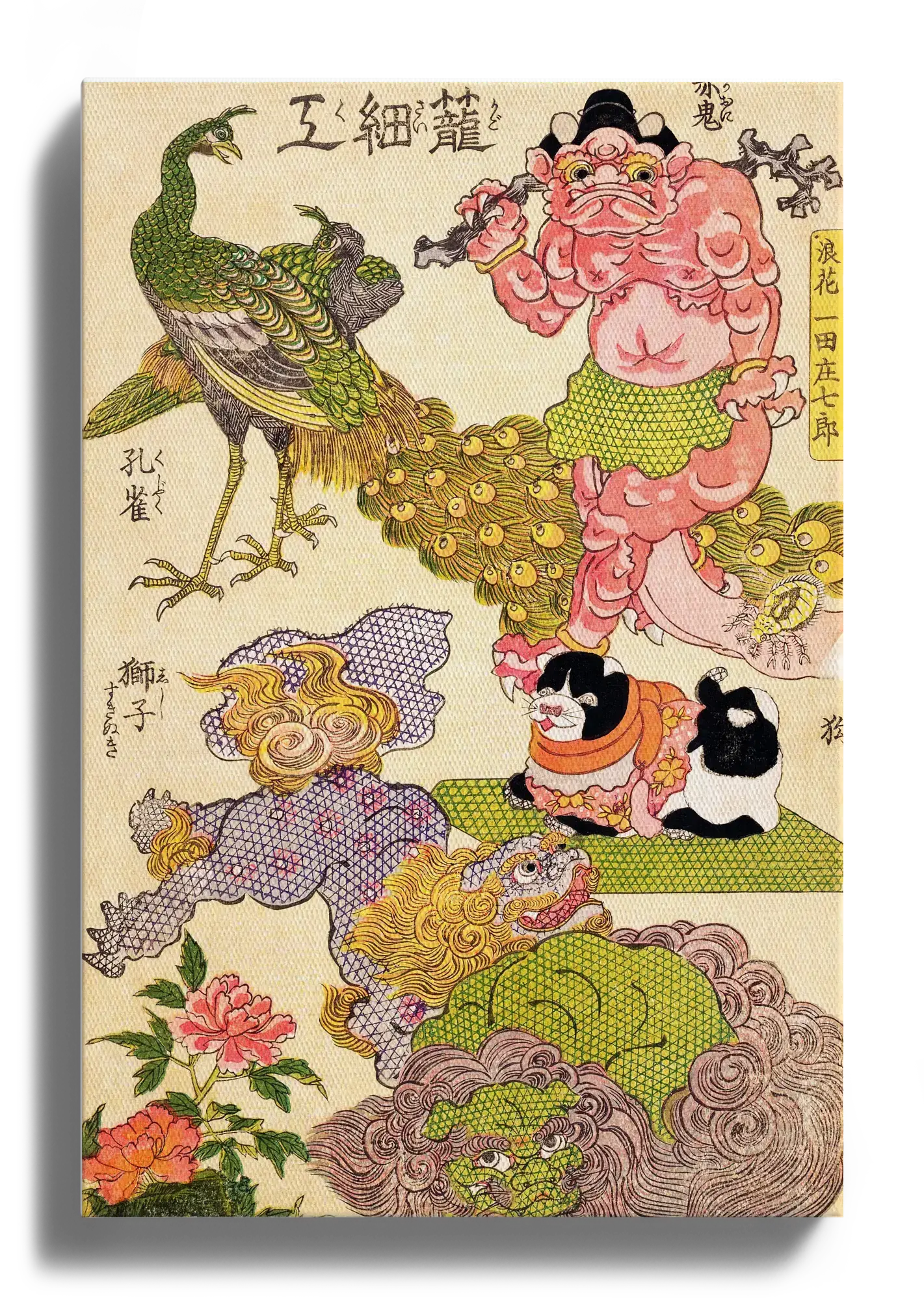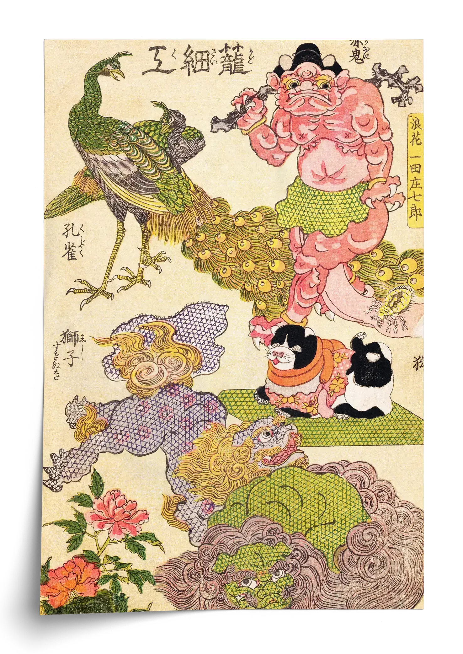 Create your art print now and make this striking Japanese woodblock the centerpiece of your wall. The artwork shows a regal peacock with a cascading green‑and‑gold tail, a pink oni‑like figure with a wry expression, playful lion‑dogs emerging from swirling clouds, and a small black‑and‑white dog in ornate robes. Blooming peonies and bold calligraphy punctuate the scene, while intricate scale patterns and warm washi tones add depth and texture, balancing elegance, folklore, and a touch of humor.