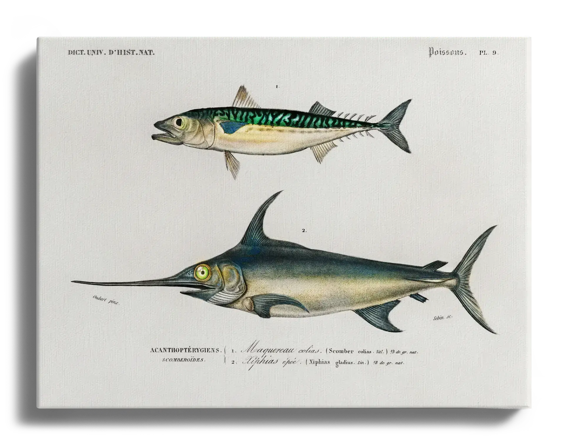Customize yours and order now. This vintage natural history plate from the 1840s shows two elegant fish on a soft ivory background: above, a lively Atlantic mackerel with emerald and ink‑black stripes; below, a sleek swordfish with a long bill, bright golden eye, and steel‑blue body that fades toward the tail. Crisp lithographic shading and fine scales meet French captions such as Poissons and Latin species names, giving the artwork a calm, scholarly feel that suits coastal and classic interiors alike.