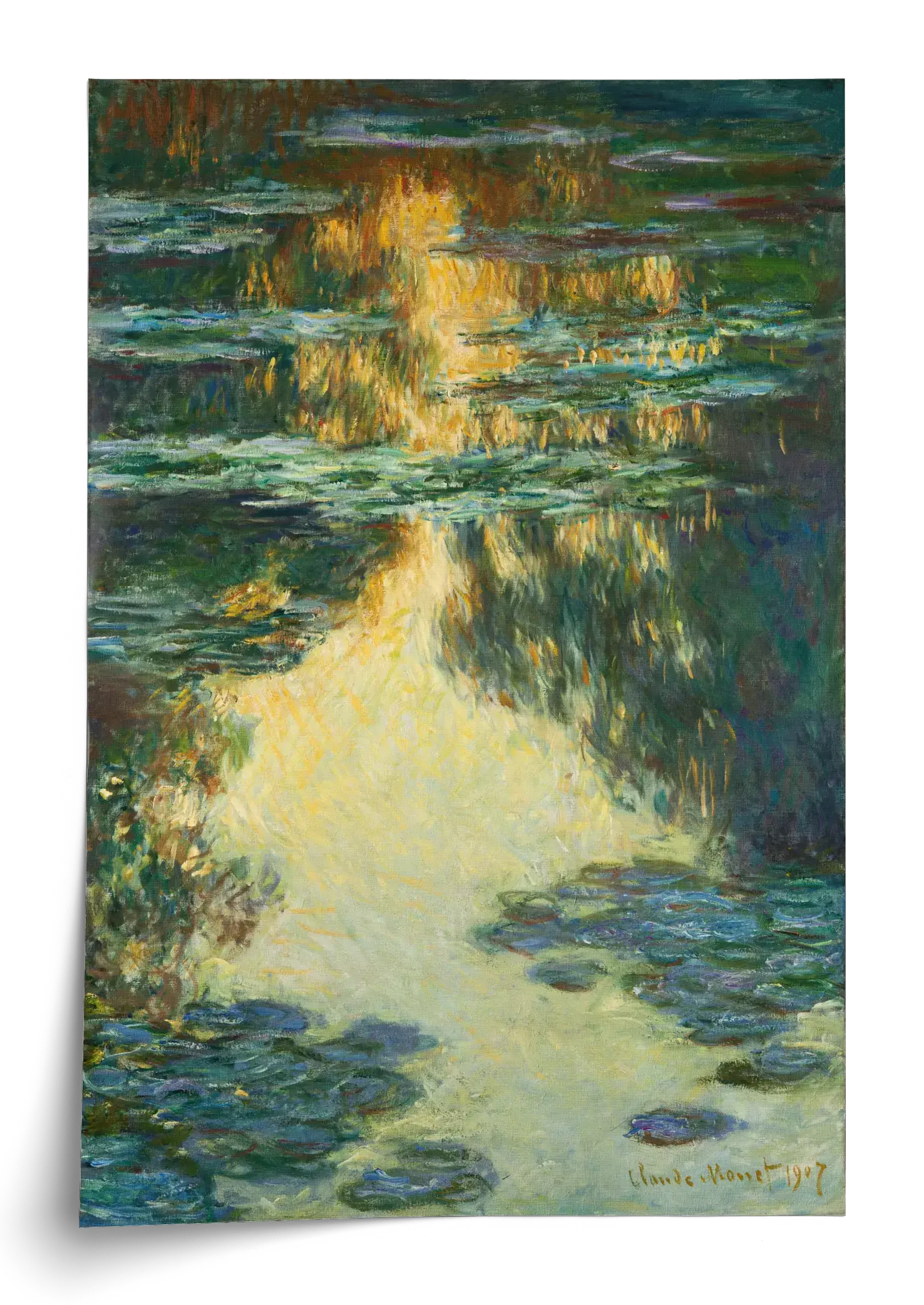 Make this Water Lilies art print yours today. In this luminous scene by Claude Monet, ripples of warm golden light spill across a quiet pond and shimmer between drifting lily pads. Deep greens and blues surround a vertical glow that feels like late afternoon sun, while tiny strokes of violet and teal suggest moving water. The loose brushwork keeps everything gently in motion, the reflections blur into color, and the calm composition leads your eyes through a serene, light-soaked moment.