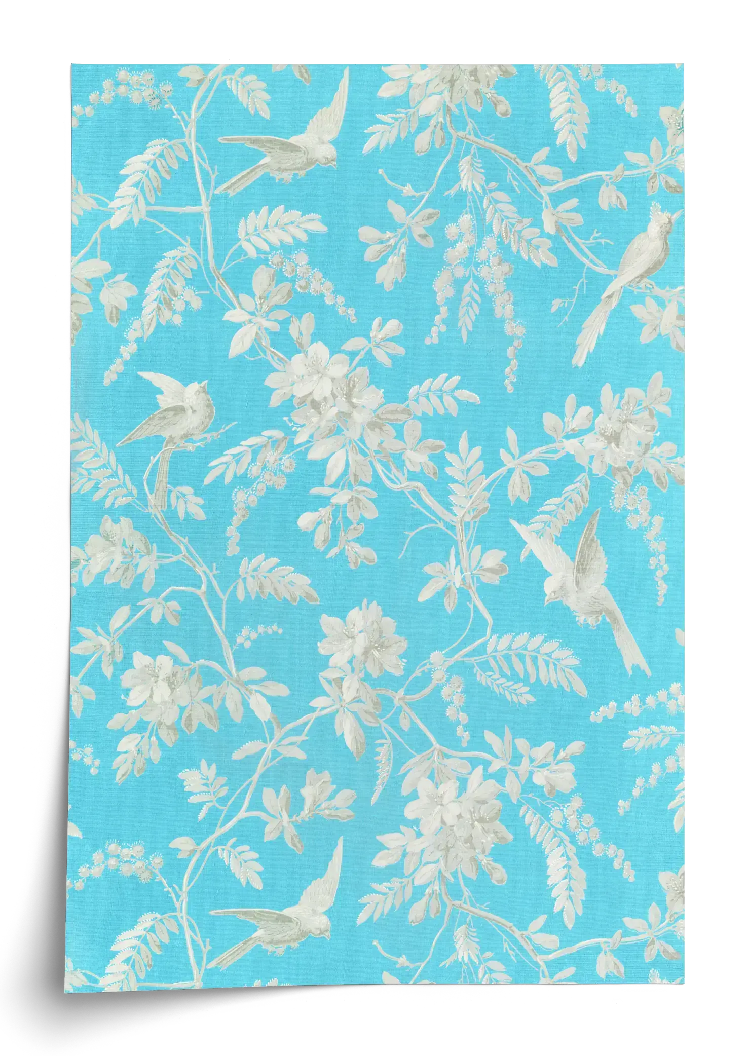 Create your print now and make it yours. This light, uplifting pattern features soft ivory birds resting and in mid-flight among clusters of blossoms, fern-like leaves, and tiny berries on a bright aqua background. The fine linework keeps the feathers and petals crisp, while the turquoise field adds a fresh, modern pop. The repeat flows like a gentle breeze, so it feels calm and graceful rather than busy—vintage in spirit, clean in execution, and easy to match with natural wood, whites, and coastal tones.
