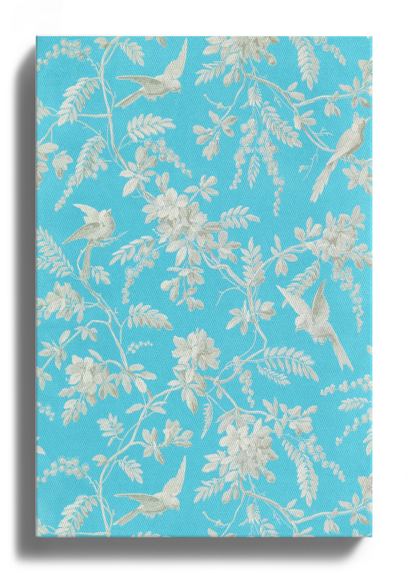 Look closer and you’ll notice the rhythm: birds angled in different directions, blossoms opening at varied stages, and slender stems that weave without crowding the space. The neutral cream ink sits softly over the aqua, giving that classic wallpaper-and-textile charm with a contemporary palette. It’s serene from afar and pleasantly detailed up close, so it holds interest without overwhelming a room.