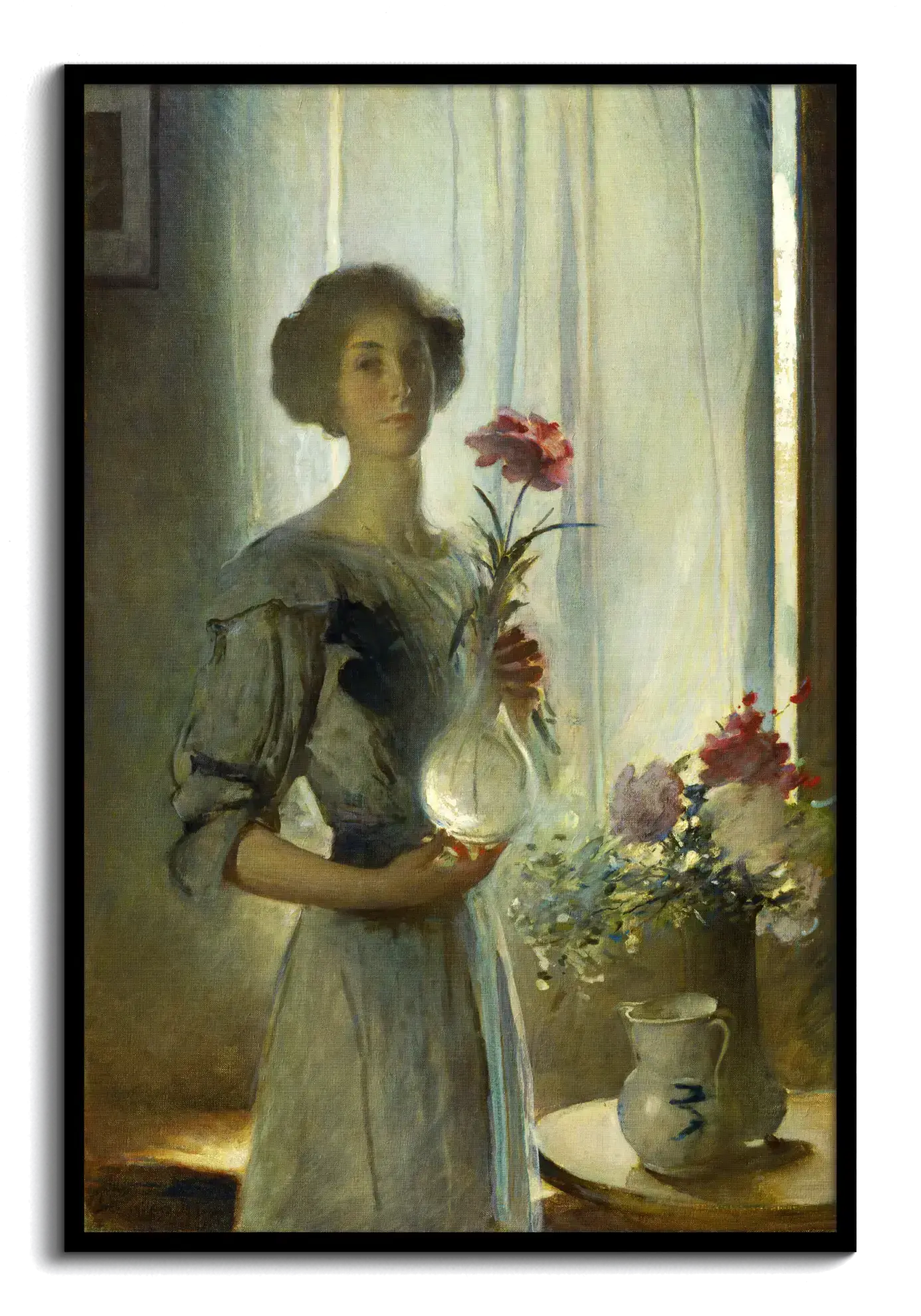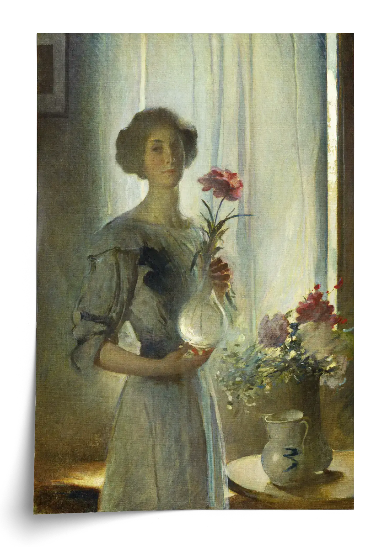 June Art Print - John White Alexander: woman in soft light with pink flower - Order yours