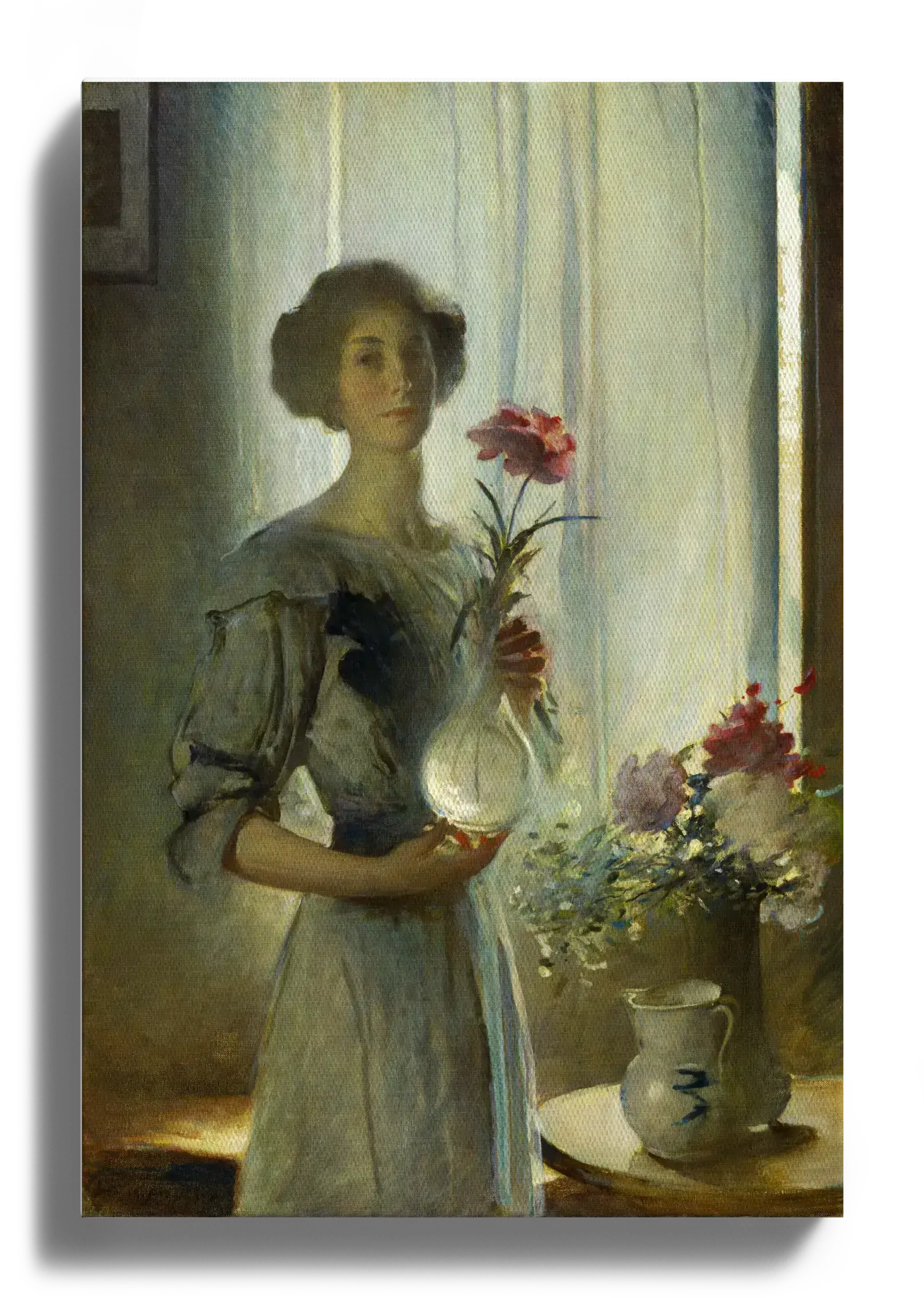 Customize your print and order in minutes. This gentle summer portrait glows with window light: a woman in a soft blue-gray dress stands before sheer curtains, holding a clear glass vessel that catches a bright spark of reflection. A single rosy flower lifts at her shoulder while, on a small round table, a jug and a loose bouquet echo the warm blush tones. Subtle brushwork and cool shadows shape her calm expression, and the whole scene feels quiet, timeless, and bathed in early morning air.