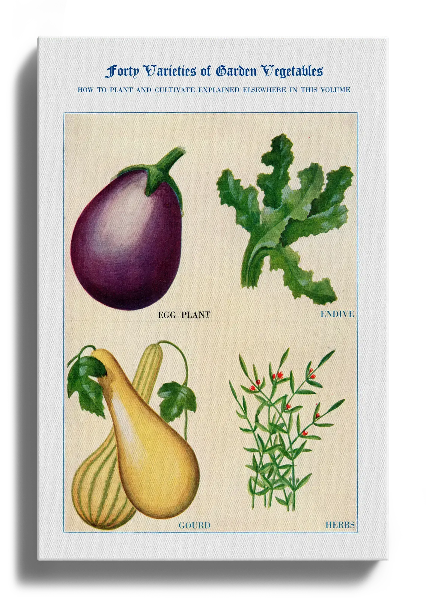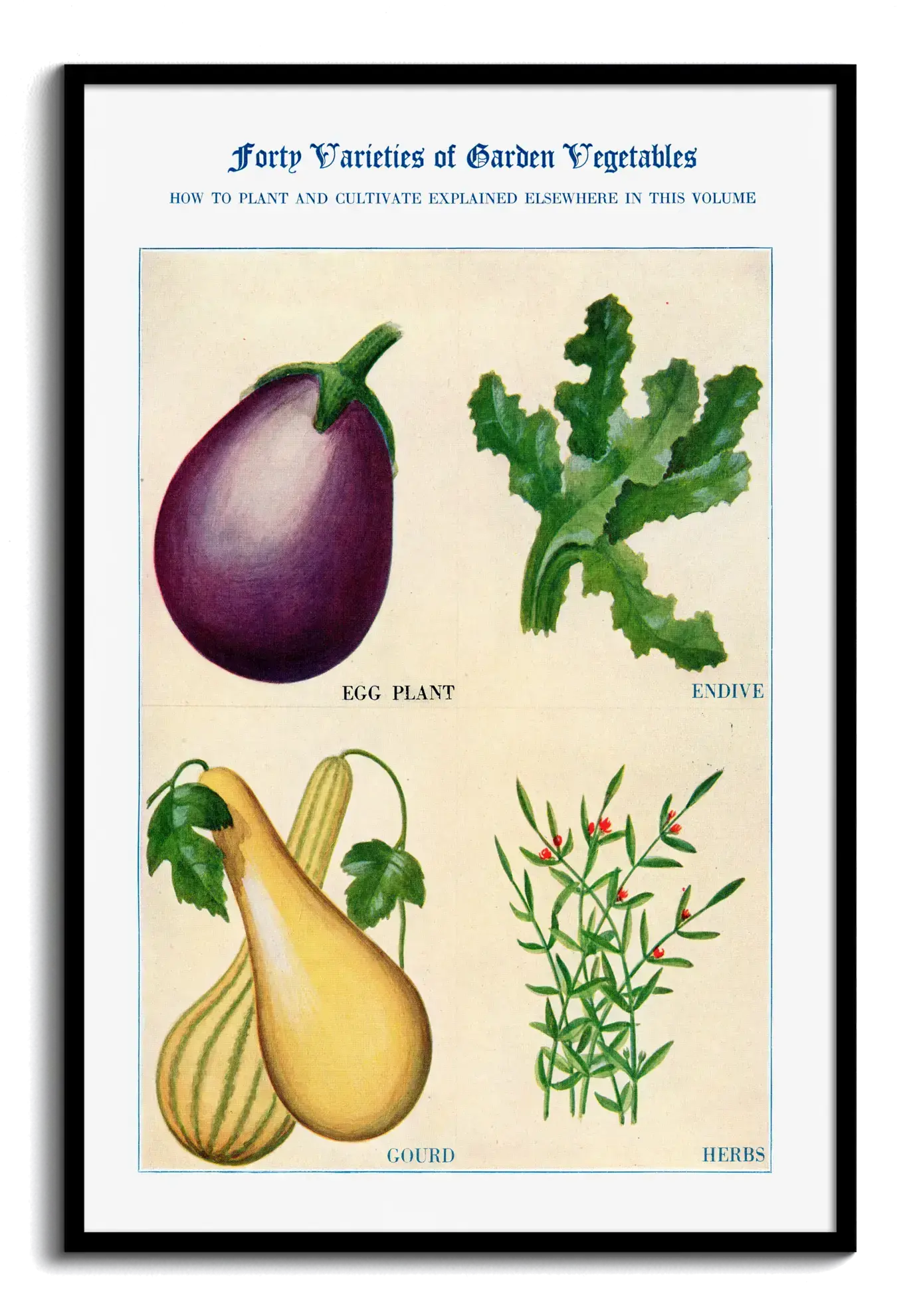 Lámina botánica vintage de verduras: berenjena, endibia, calabaza y hierbas - cómprala