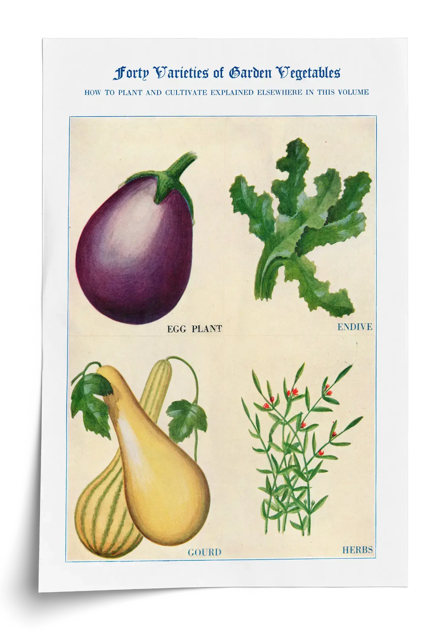 Personaliza tu lámina y pídela ahora. La ilustración muestra una acuarela botánica de estilo vintage con cuatro protagonistas: arriba a la izquierda, una berenjena de violeta intenso; a la derecha, hojas rizadas de escarola; en la parte inferior, una calabaza alargada junto a otra estriada; y, frente a ellas, un ramillete de hierbas con pequeñas bayas rojas. El fondo crema y la rotulación clásica en inglés le dan aire de lámina enciclopédica, con el encabezado Forty Varieties of Garden Vegetables que refuerza su encanto editorial.