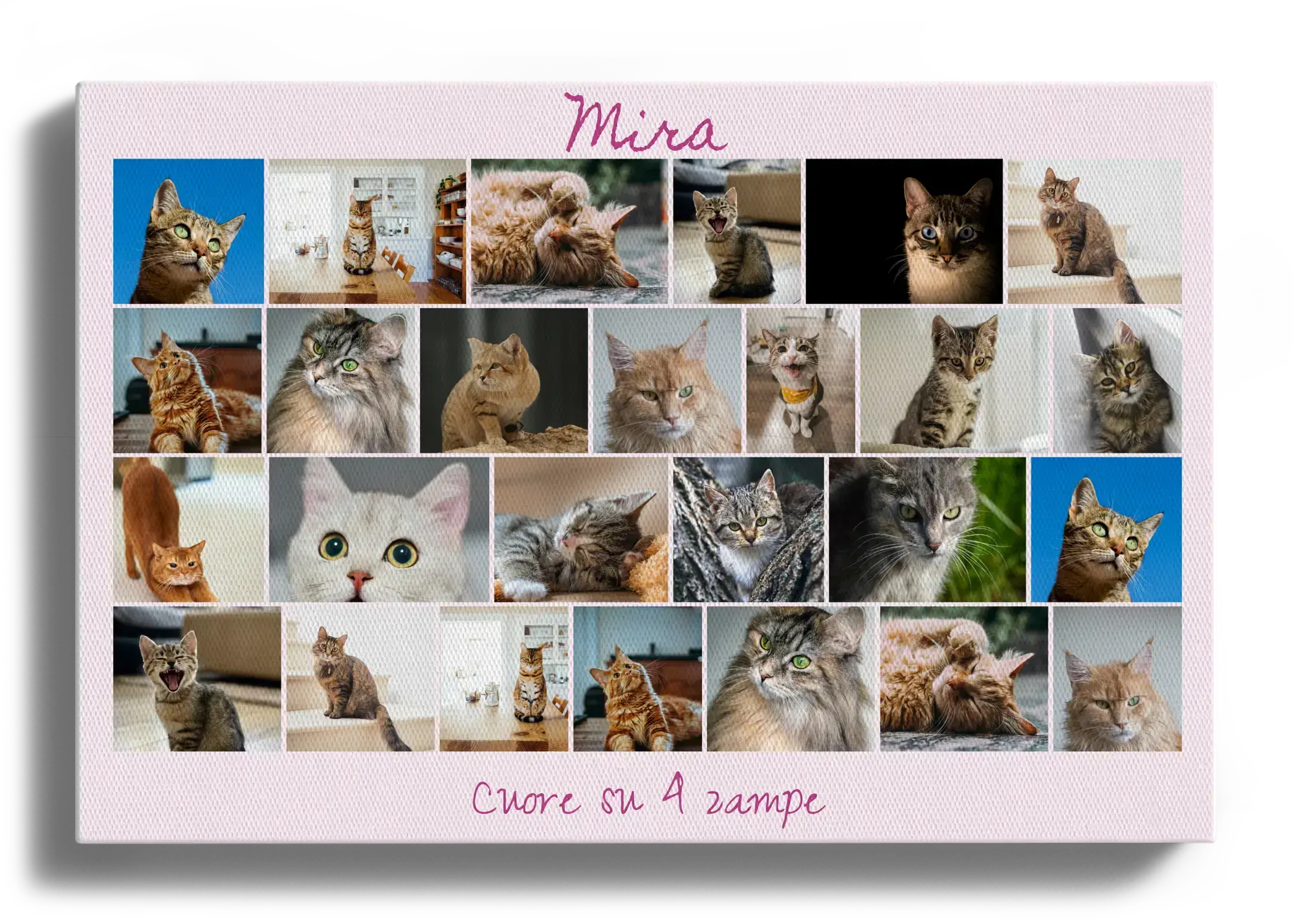 Crea ora la tua stampa personalizzata. Trasforma le foto della tua gatta o del tuo gatto in una composizione unica: griglia ordinata, cuore tenero, numeri o testo creativo. Aggiungi titoli personali come Cuore a 4 zampe o Re del divano, scegli i migliori scatti e impagina tutto in pochi minuti.