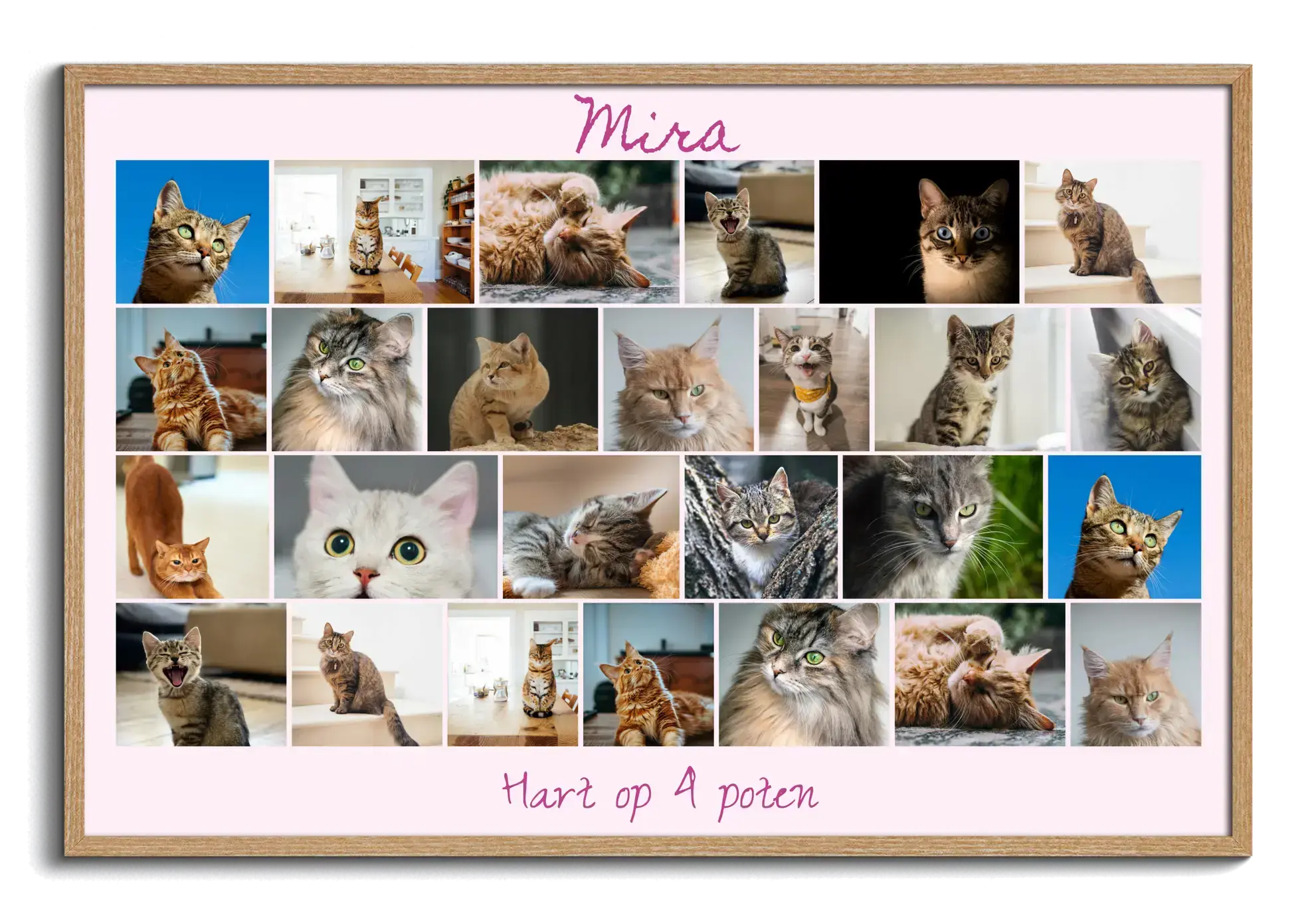 Begin nu en maak jouw katten-collage. Zet je lievelingsfoto’s van je kat in speelse sjablonen zoals hart, raster of tekst, geef het een titel zoals Hart op vier pootjes, kies kleuren en aantallen, en bestel het resultaat als poster, ingelijst, canvas, acryl, alu-dibond of als download.