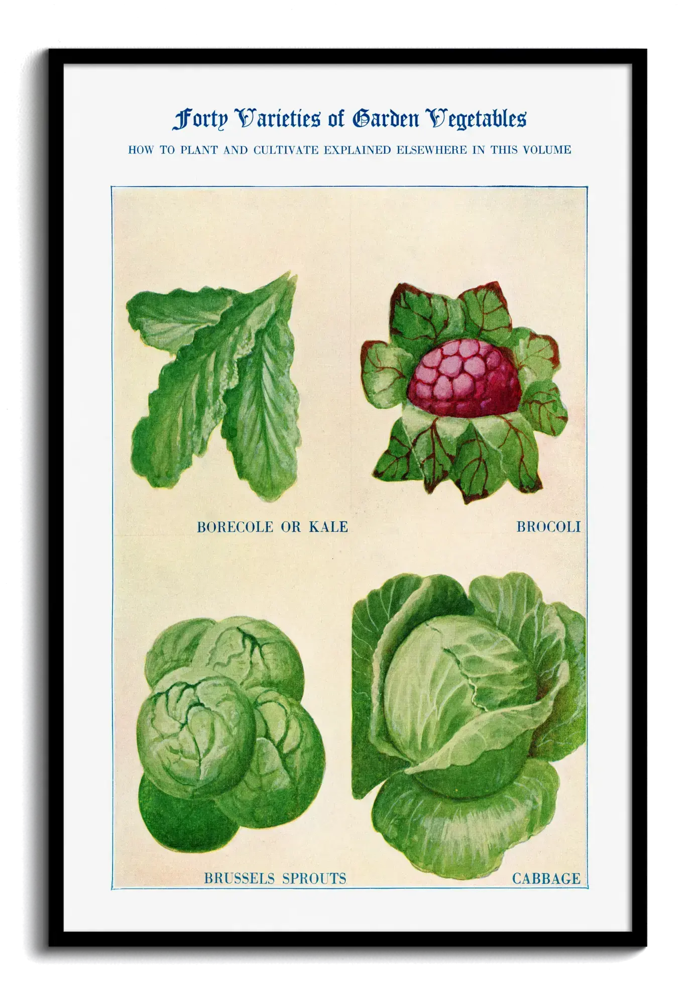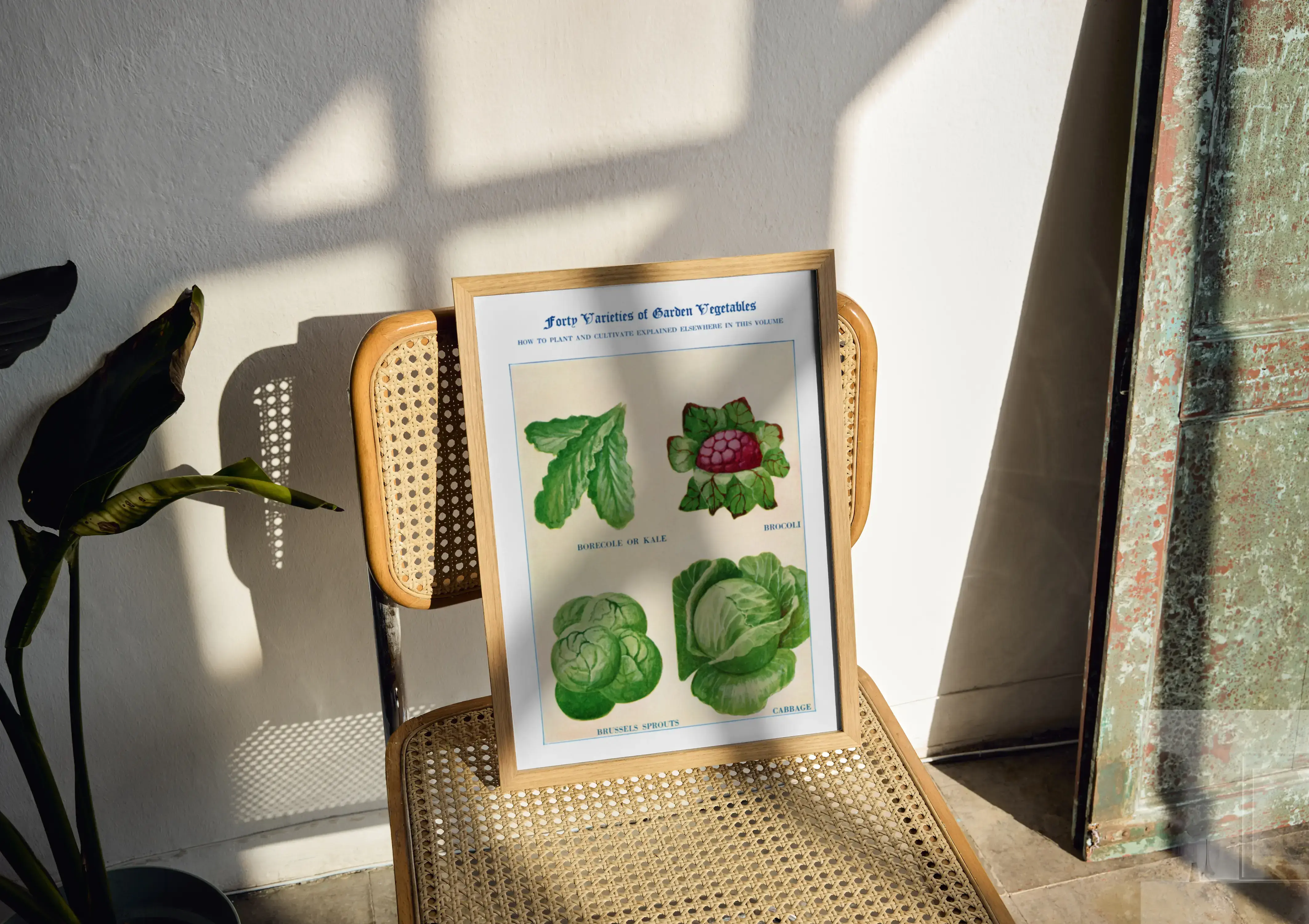 Kies je formaat en materiaal en maak dit vintage groente-aquarel meteen van jou. De illustratie toont een klassieke botanische plaat met vier panelen: linksboven borecole of boerenkool, rechtsboven broccoli, linksonder spruitjes en rechtsonder een compacte kool. Elk vak heeft een subtiele blauwe omlijning en een Engelse titel, bovenaan lees je Forty Varieties of Garden Vegetables met een instructieregel. De crème achtergrond, zachte aquarelstructuur en rijke groentinten zorgen voor een rustige, educatieve charme die perfect bij een keuken past.