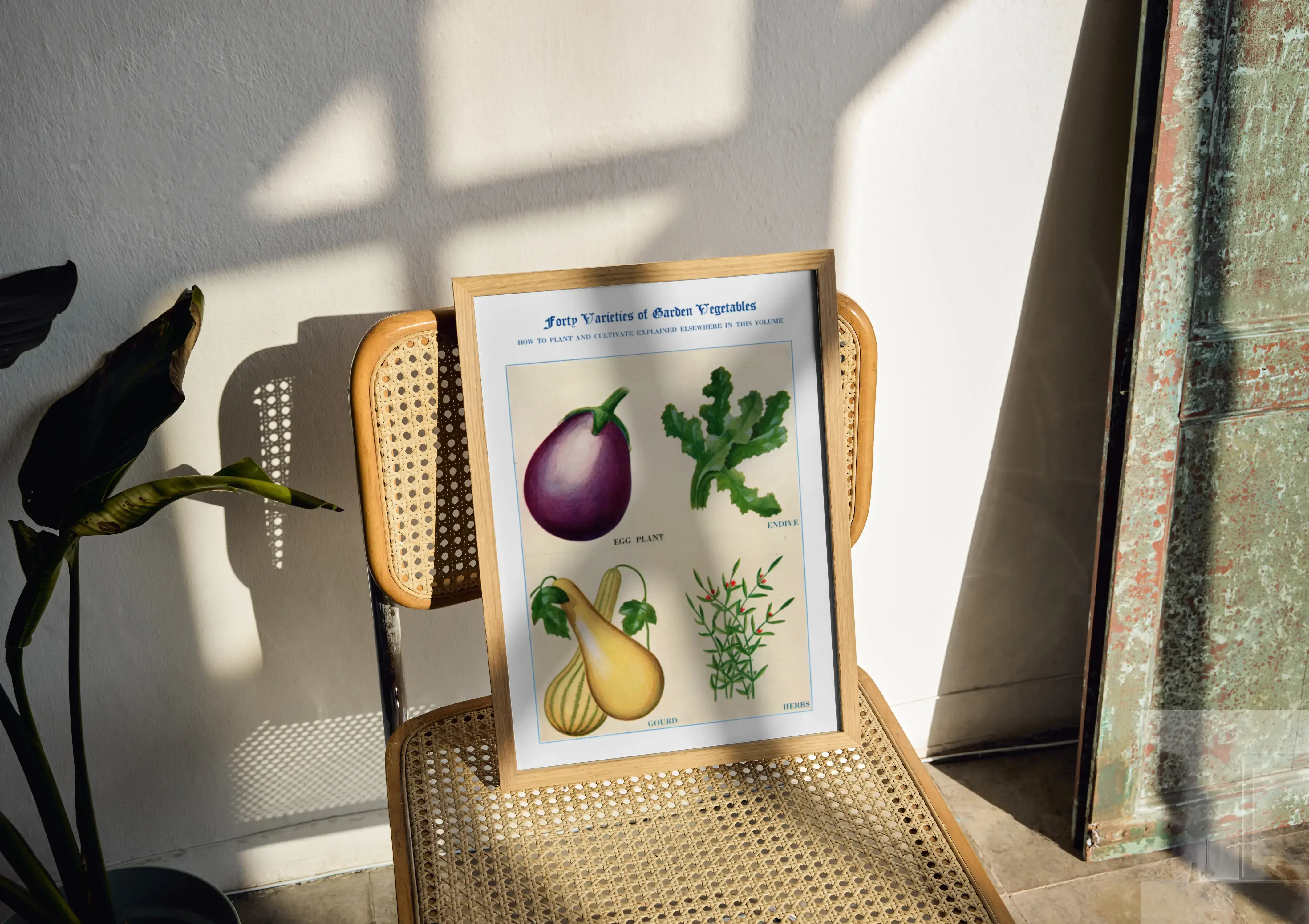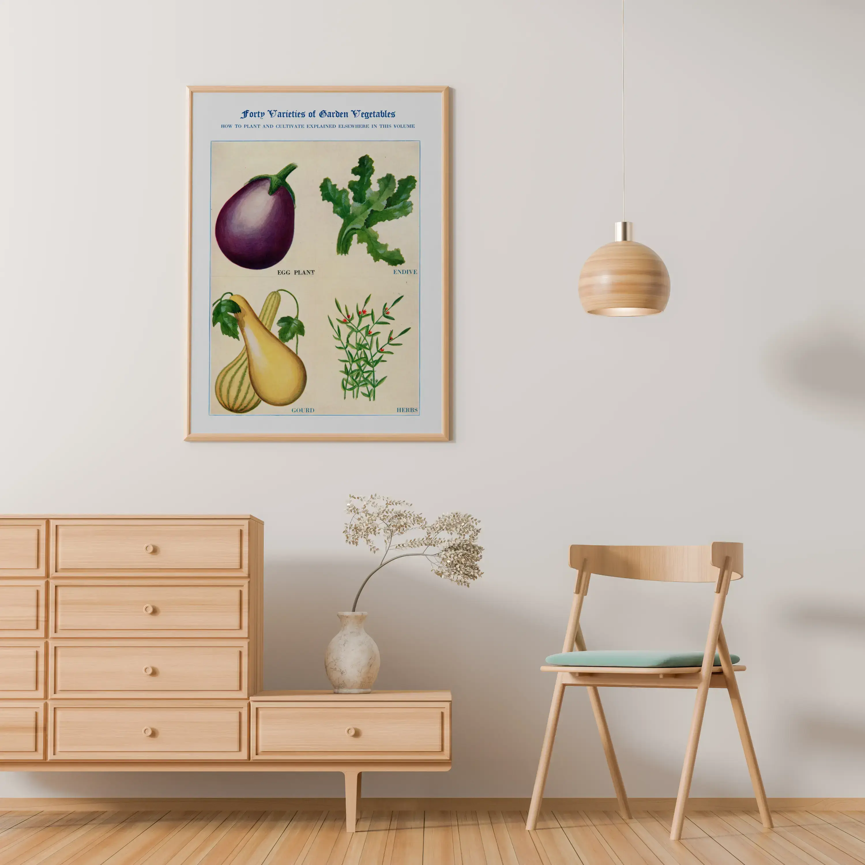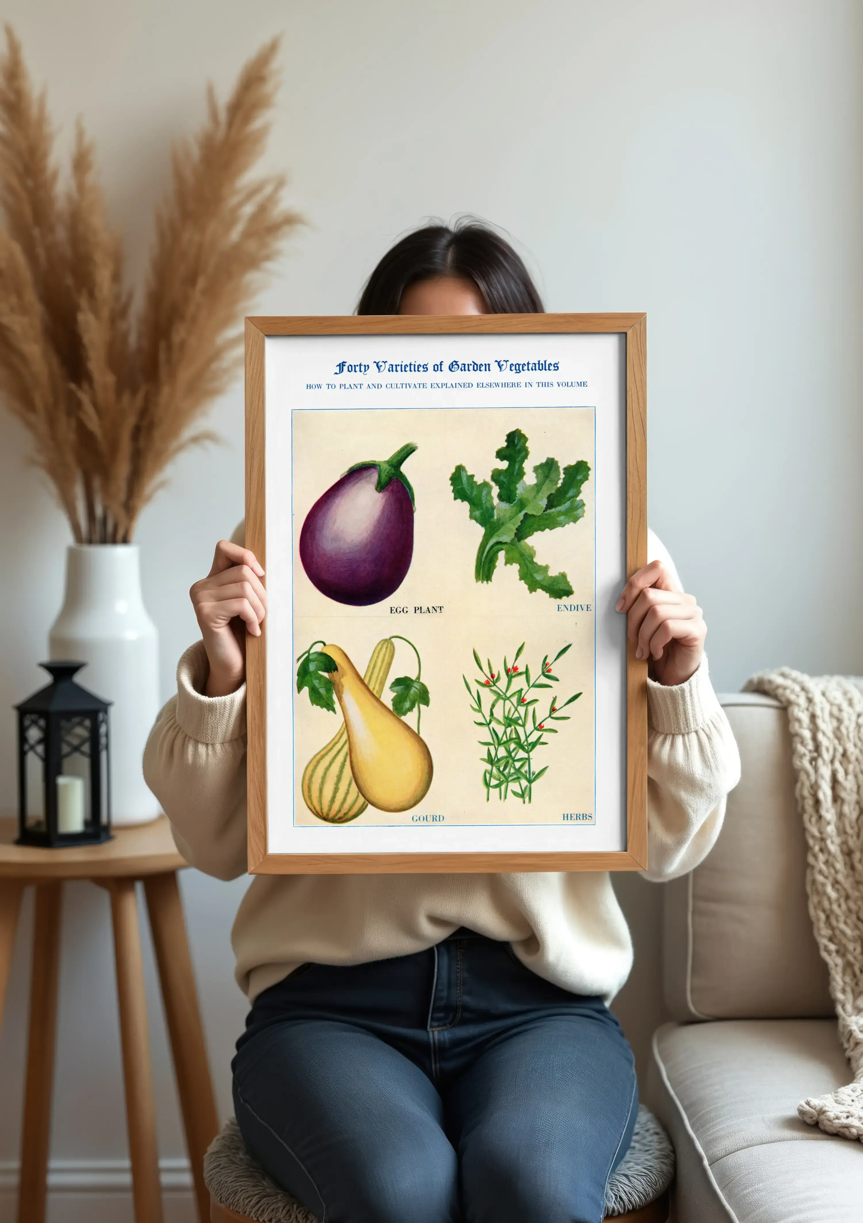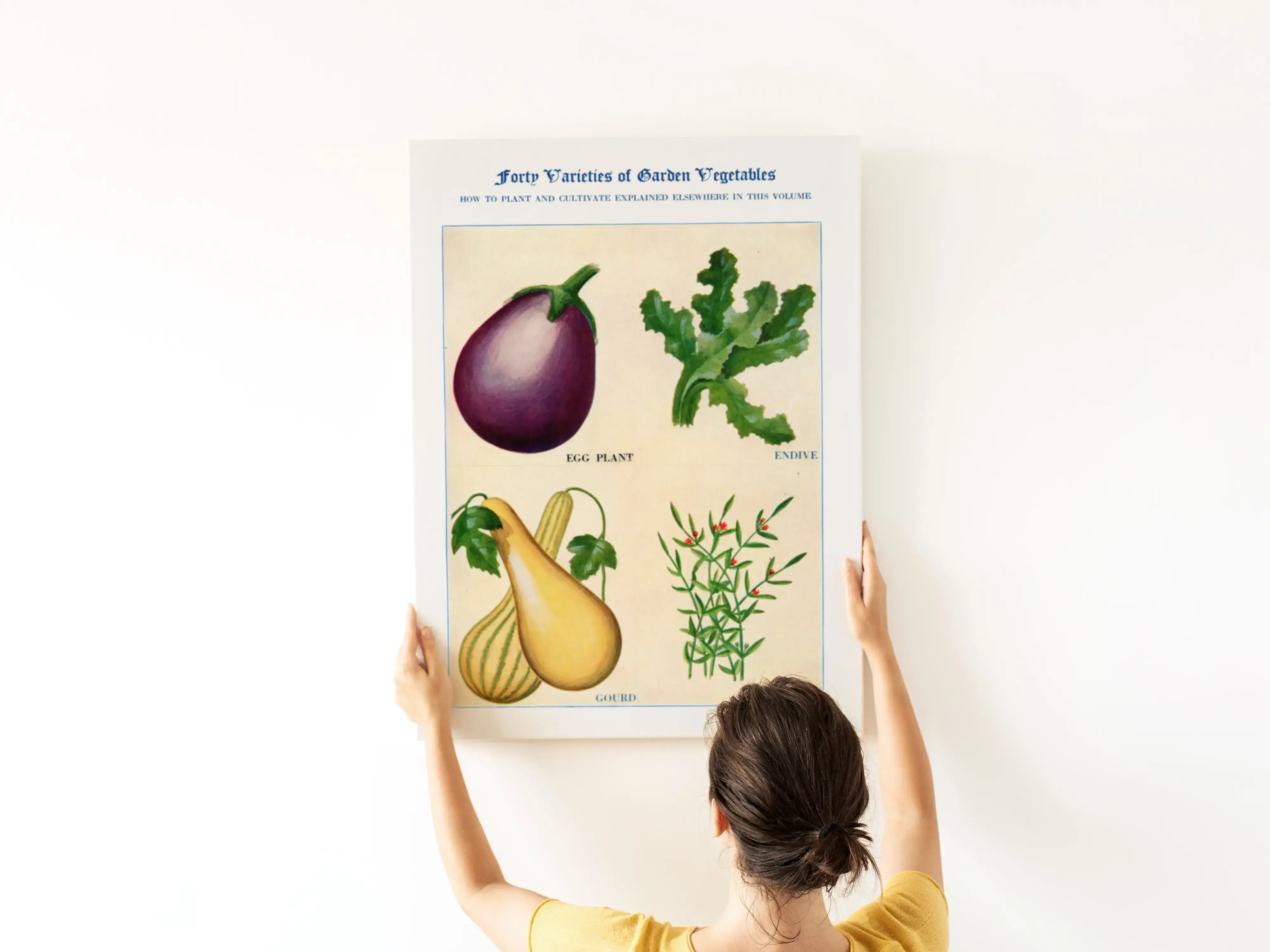 Het motief is geïnspireerd op historische botanische prenten. De compositie in vier vakken houdt het beeld rustig en overzichtelijk, terwijl de aquareltextuur zacht overloopt van schaduw naar licht. Bovenaan staat de titel Forty Varieties of Garden Vegetables, onder de afbeeldingen vind je de benamingen egg plant, endive, gourd en herbs. Een subtiele, educatieve charme zonder drukte.